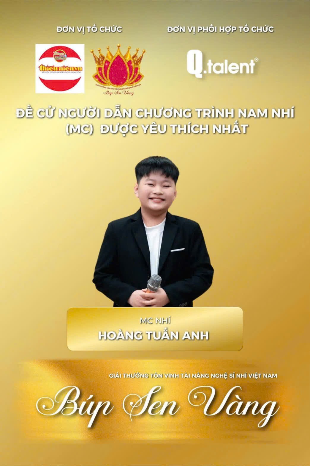 Đã xuất sắc lọt Top đề cử ở hạng mục “Người dẫn chương trình (MC) nhí được yêu thích nhất” tại Giải thưởng “Búp Sen Vàng – giải thưởng do Báo Thiếu niên Tiền phong và Nhi đồng tổ chức, nhằm ghi nhận và tôn vinh các tài năng thiếu nhi tiêu biểu trên toàn quốc .