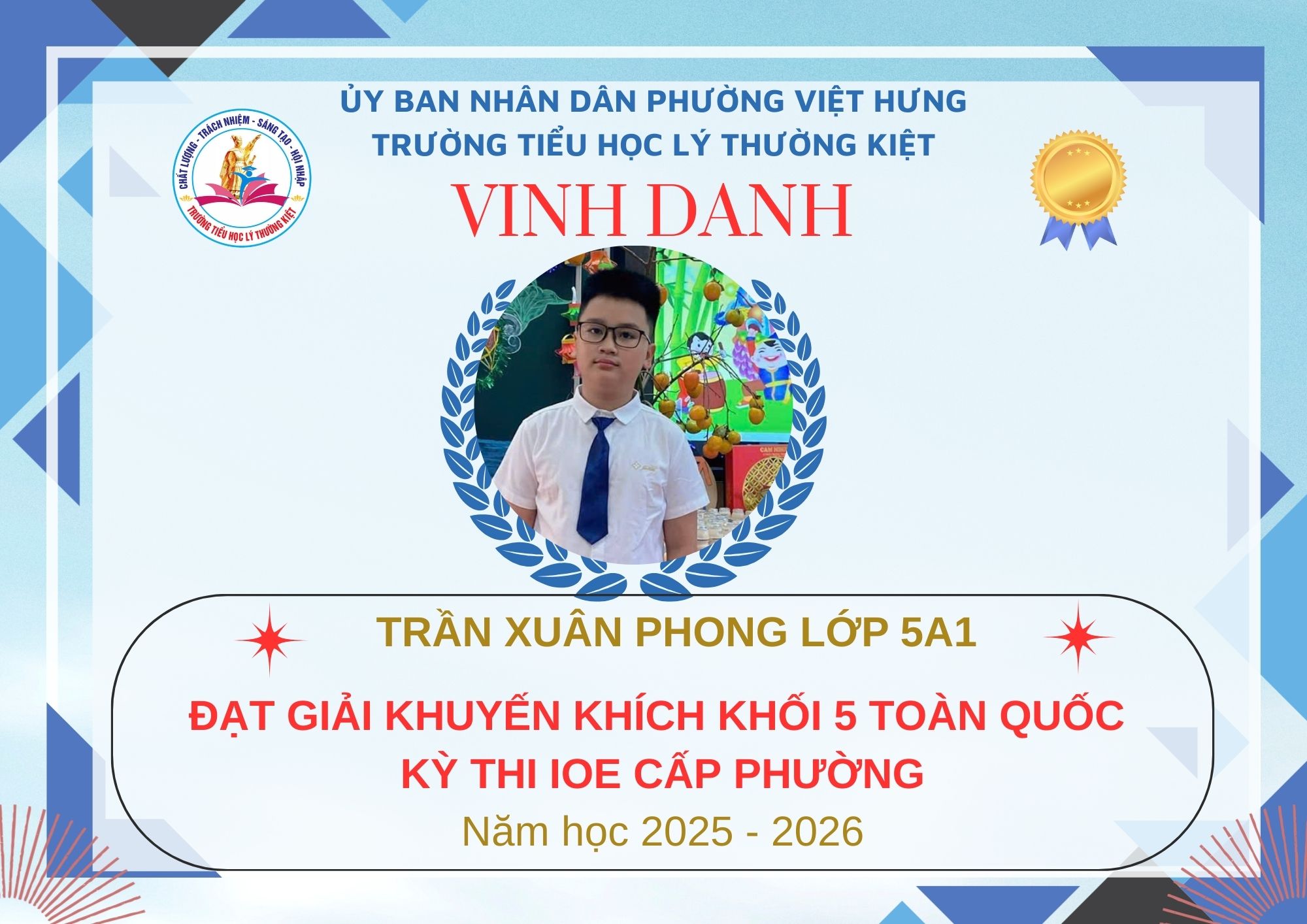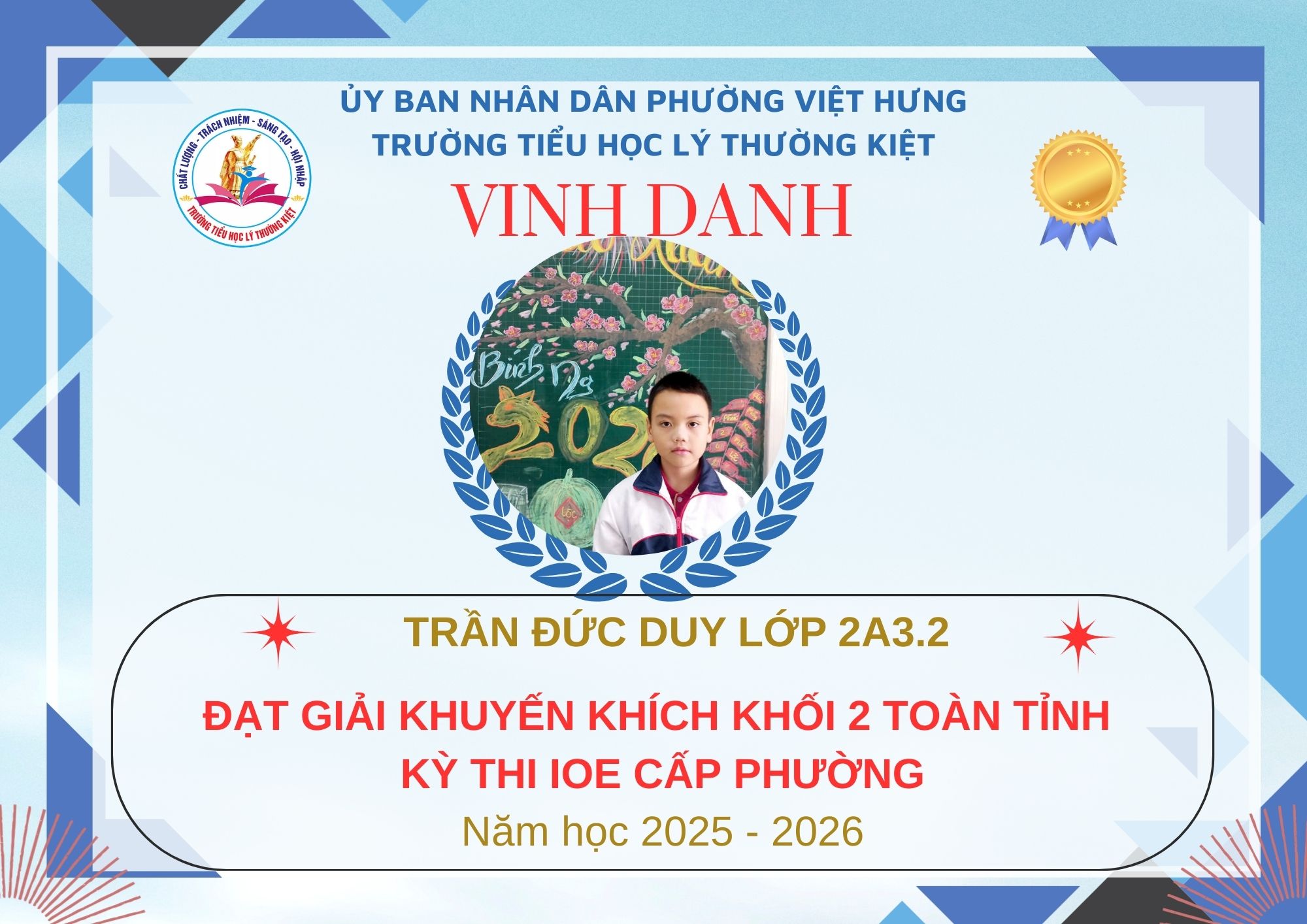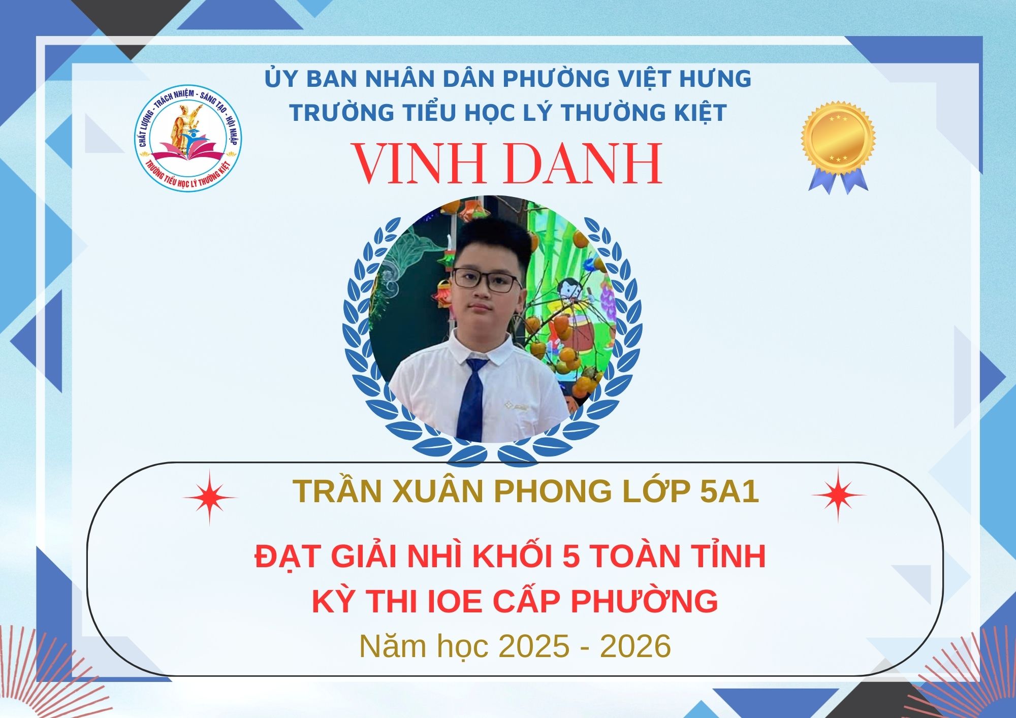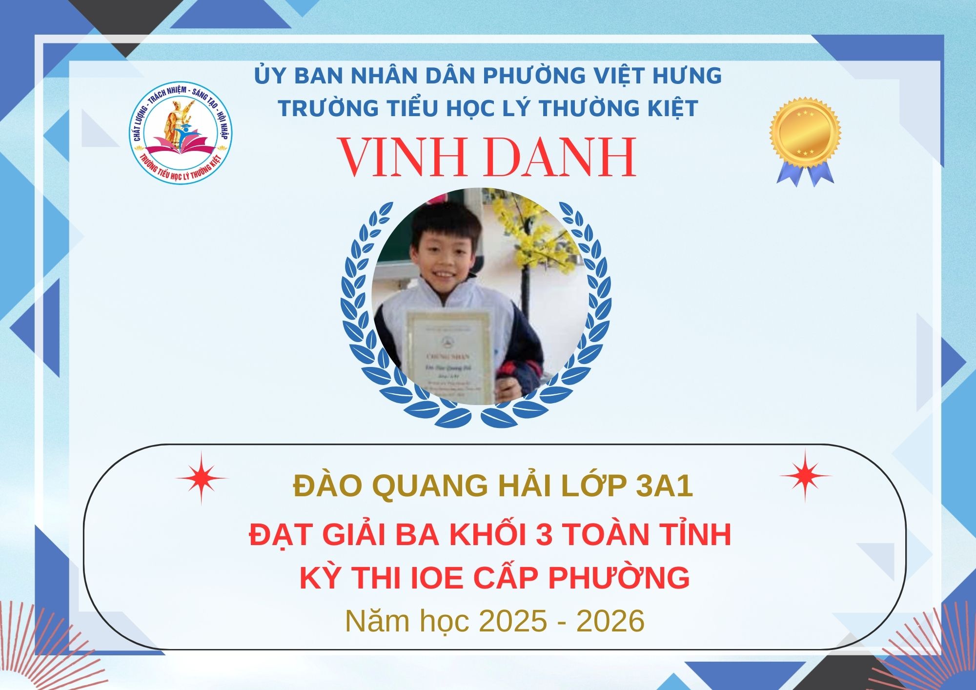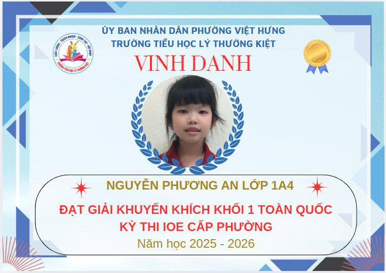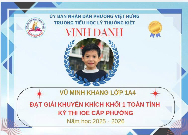 Không khí đón Tết Bính Ngọ càng thêm trọn vẹn khi Trường Tiểu học Lý Thường Kiệt vinh dự và tự hào được vinh danh với tổng số 61 giải trong kỳ thi Olympic Tiếng Anh trên Internet (IOE) cấp phường. Trong đó top Toàn Quốc là 08 giải và top Toàn Tỉnh là 53 giải. Đây là thành quả đáng tự hào của các em ghi nhận sự nỗ lực học tập không ngừng, tinh thần tự tin – chủ động – ham học hỏi của các em trong suốt quá trình ôn luyện và tham gia sân chơi trí tuệ bổ ích này.