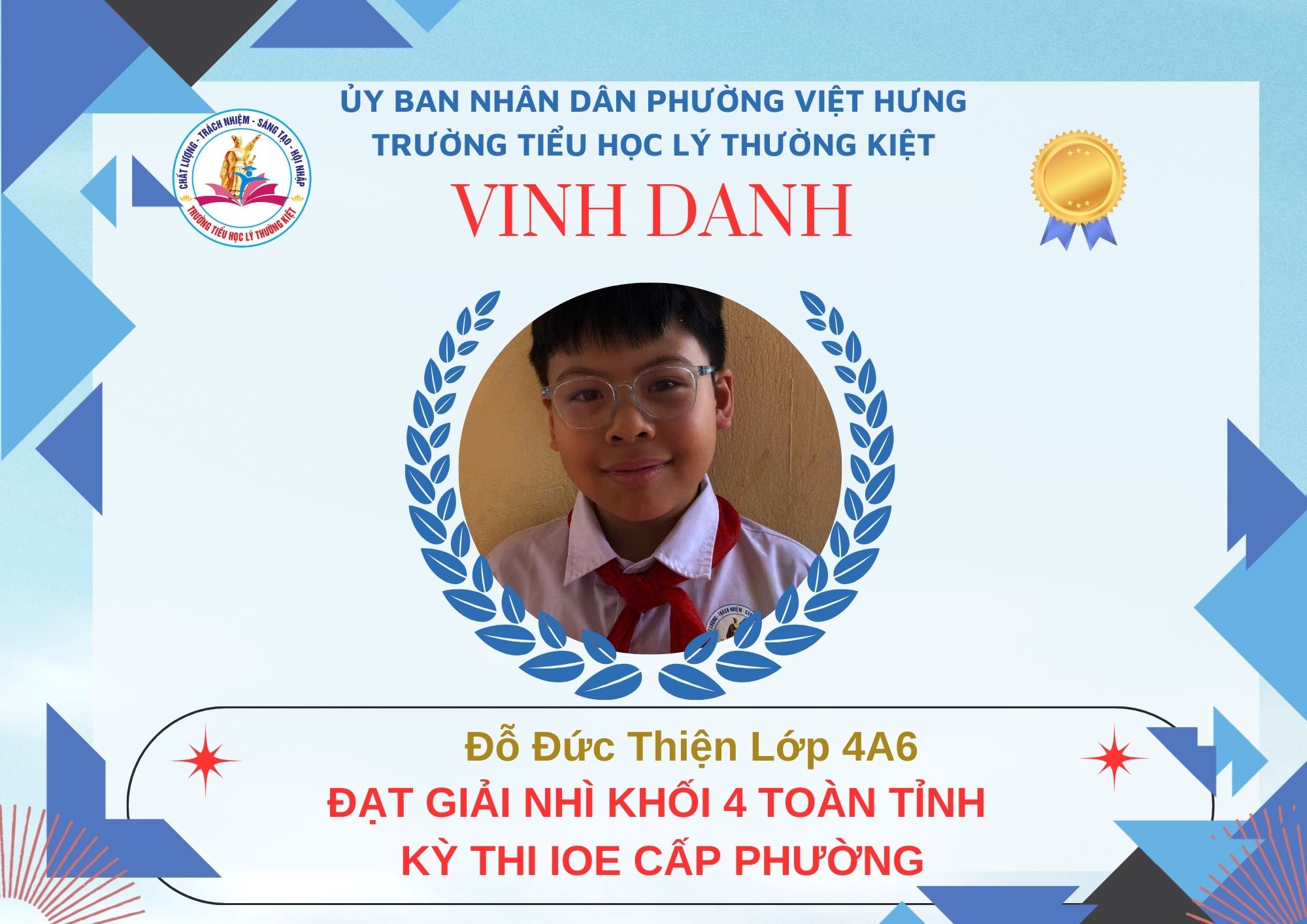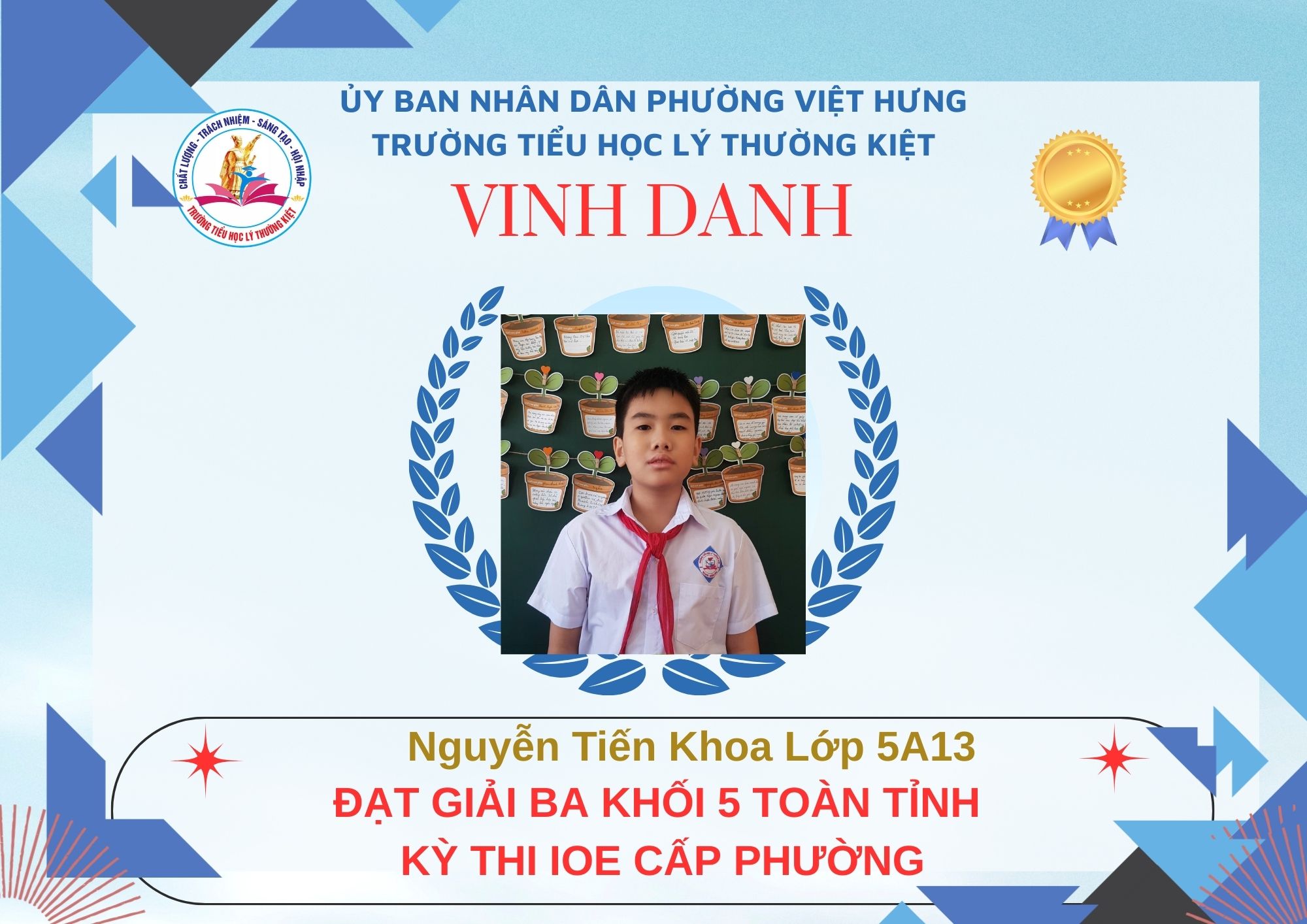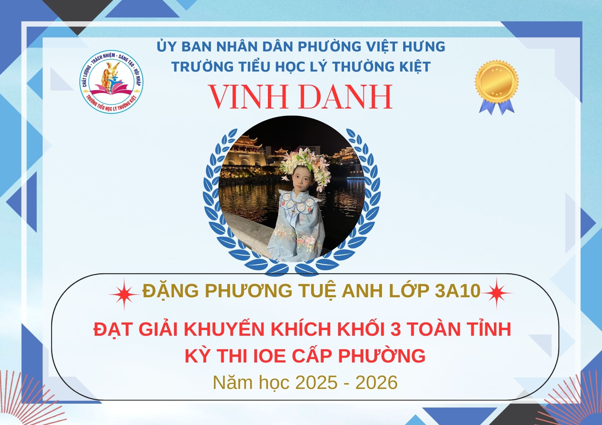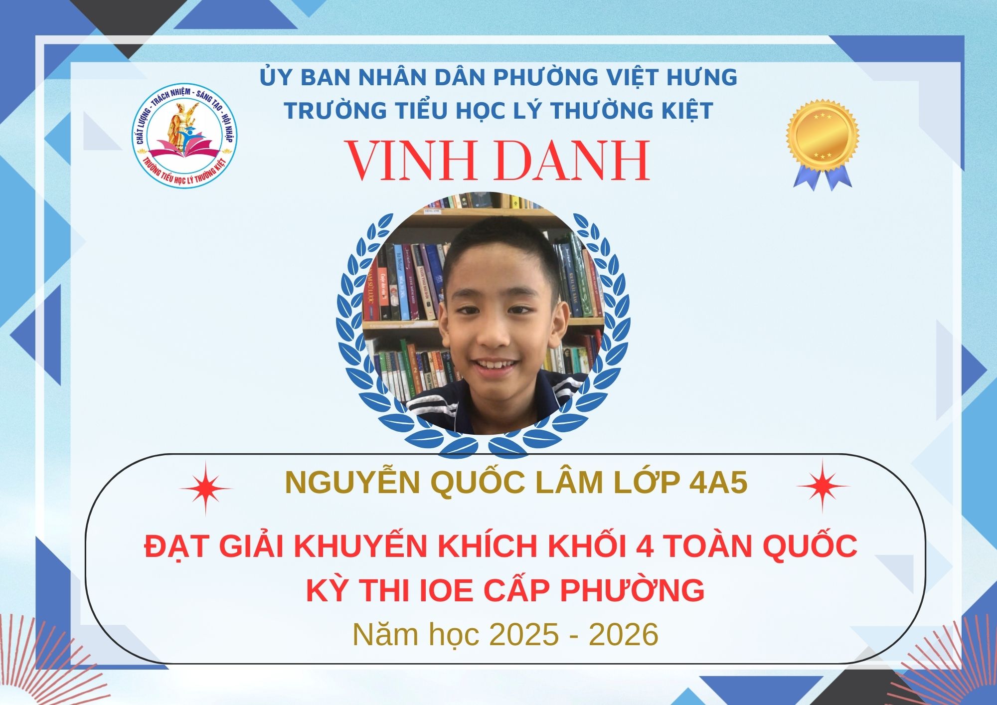 Không khí đón Tết Bính Ngọ càng thêm trọn vẹn khi Trường Tiểu học Lý Thường Kiệt vinh dự và tự hào được vinh danh với tổng số 61 giải trong kỳ thi Olympic Tiếng Anh trên Internet (IOE) cấp phường. Trong đó top Toàn Quốc là 08 giải và top Toàn Tỉnh là 53 giải. Đây là thành quả đáng tự hào của các em ghi nhận sự nỗ lực học tập không ngừng, tinh thần tự tin – chủ động – ham học hỏi của các em trong suốt quá trình ôn luyện và tham gia sân chơi trí tuệ bổ ích này.