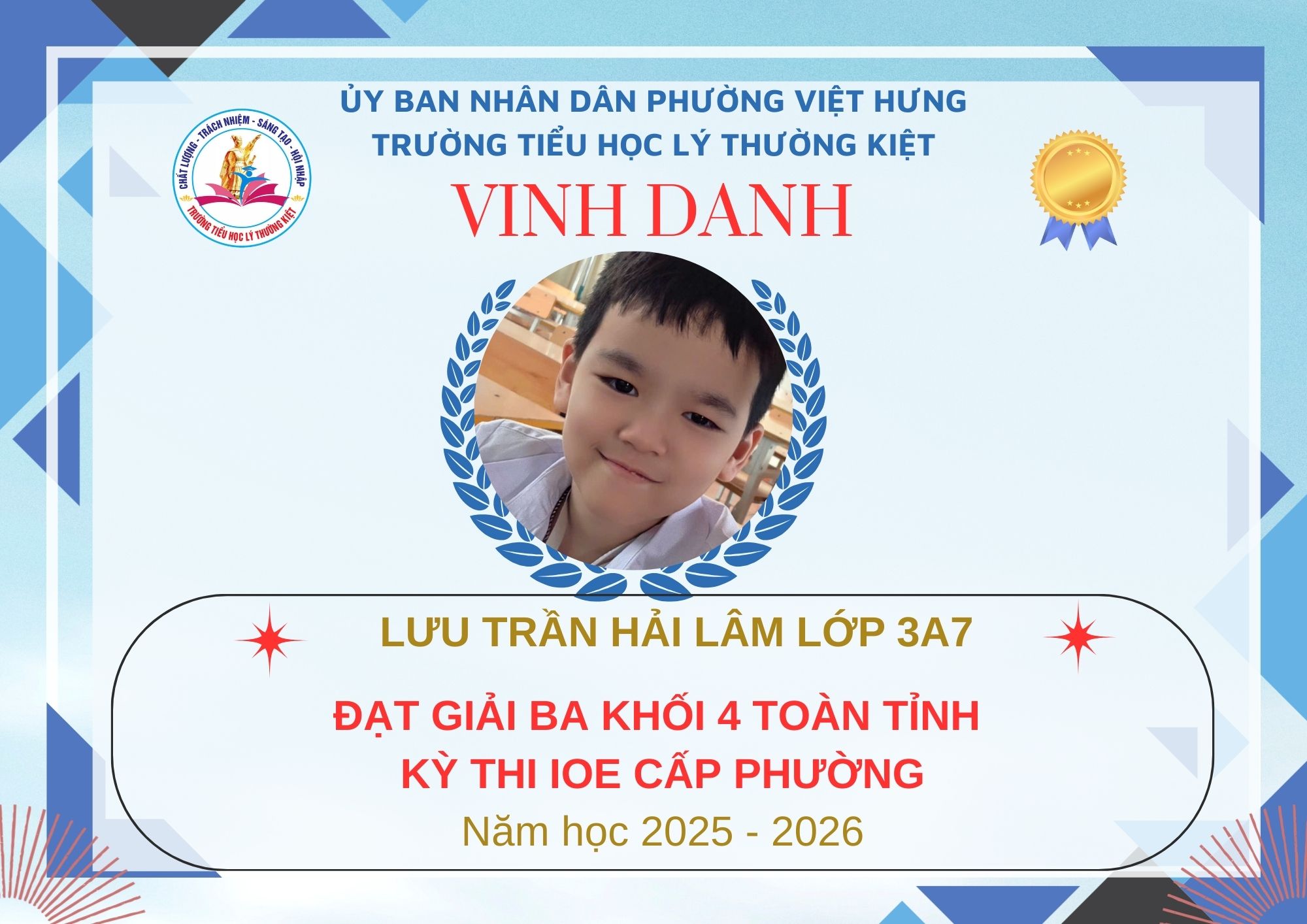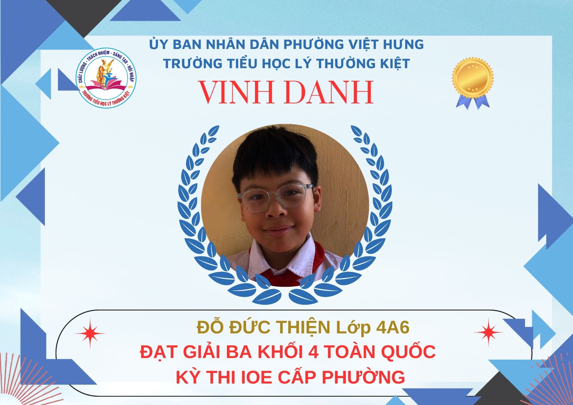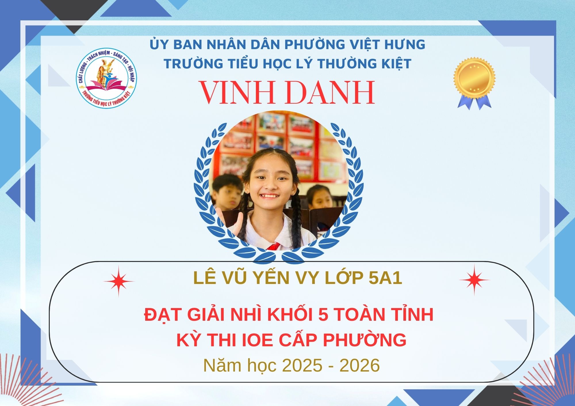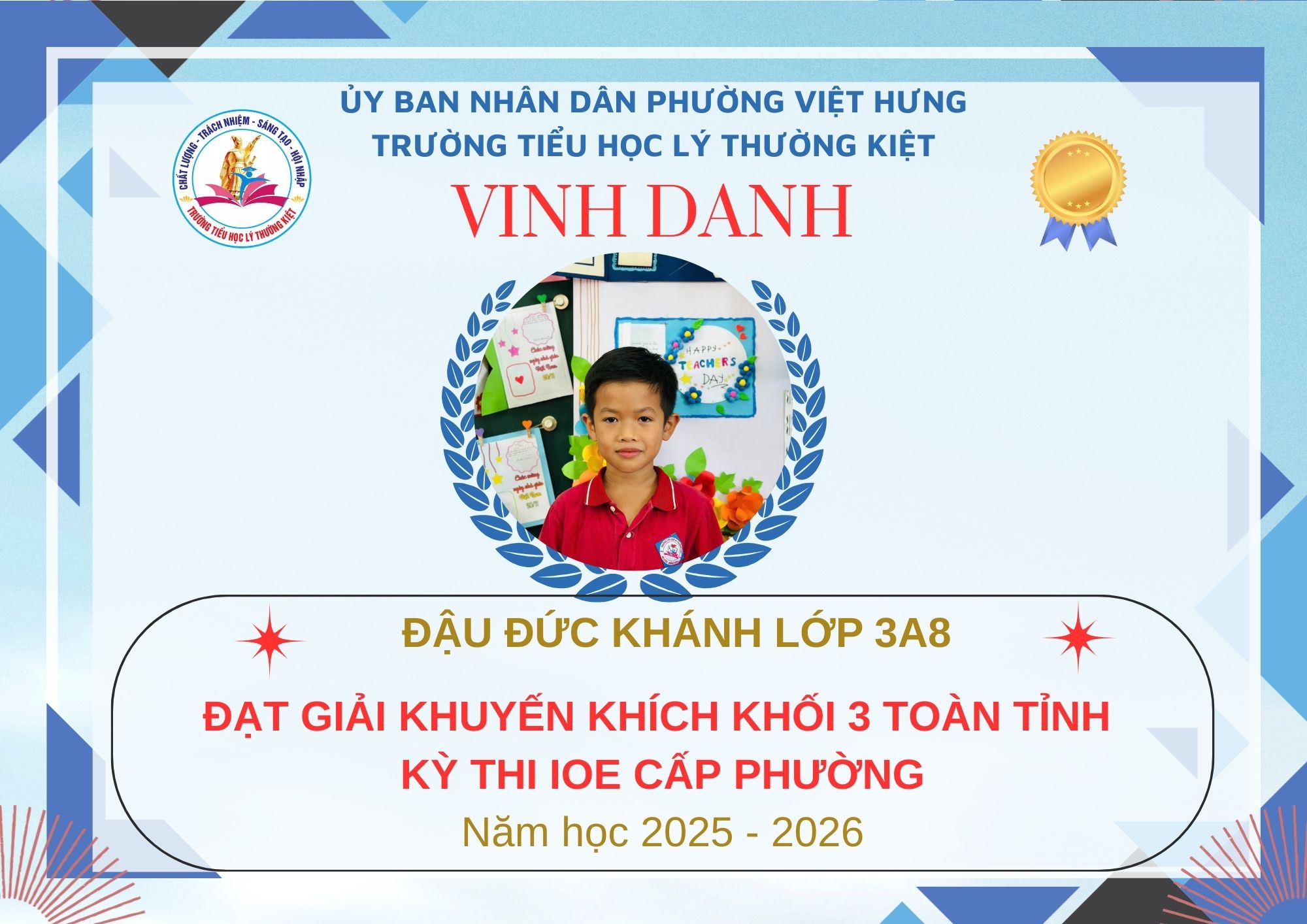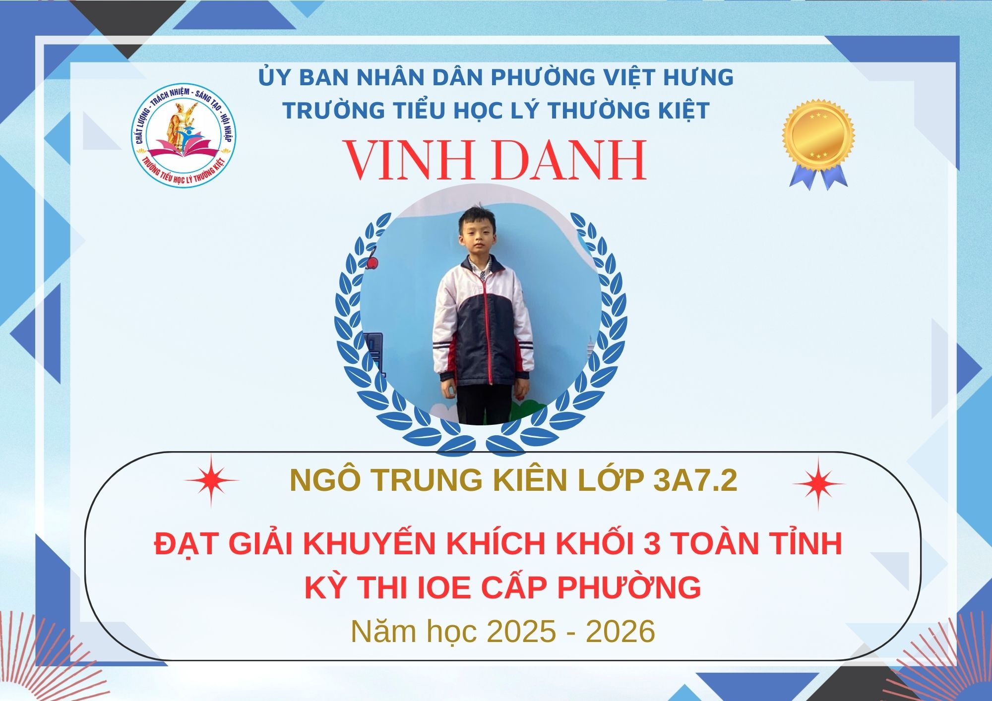 Không khí đón Tết Bính Ngọ càng thêm trọn vẹn khi Trường Tiểu học Lý Thường Kiệt vinh dự và tự hào được vinh danh với tổng số 61 giải trong kỳ thi Olympic Tiếng Anh trên Internet (IOE) cấp phường. Trong đó top Toàn Quốc là 08 giải và top Toàn Tỉnh là 53 giải. Đây là thành quả đáng tự hào của các em ghi nhận sự nỗ lực học tập không ngừng, tinh thần tự tin – chủ động – ham học hỏi của các em trong suốt quá trình ôn luyện và tham gia sân chơi trí tuệ bổ ích này.