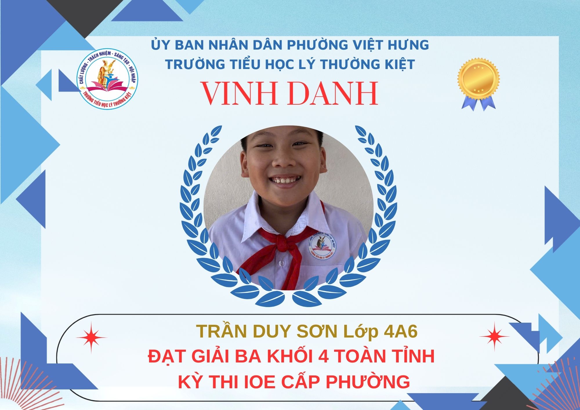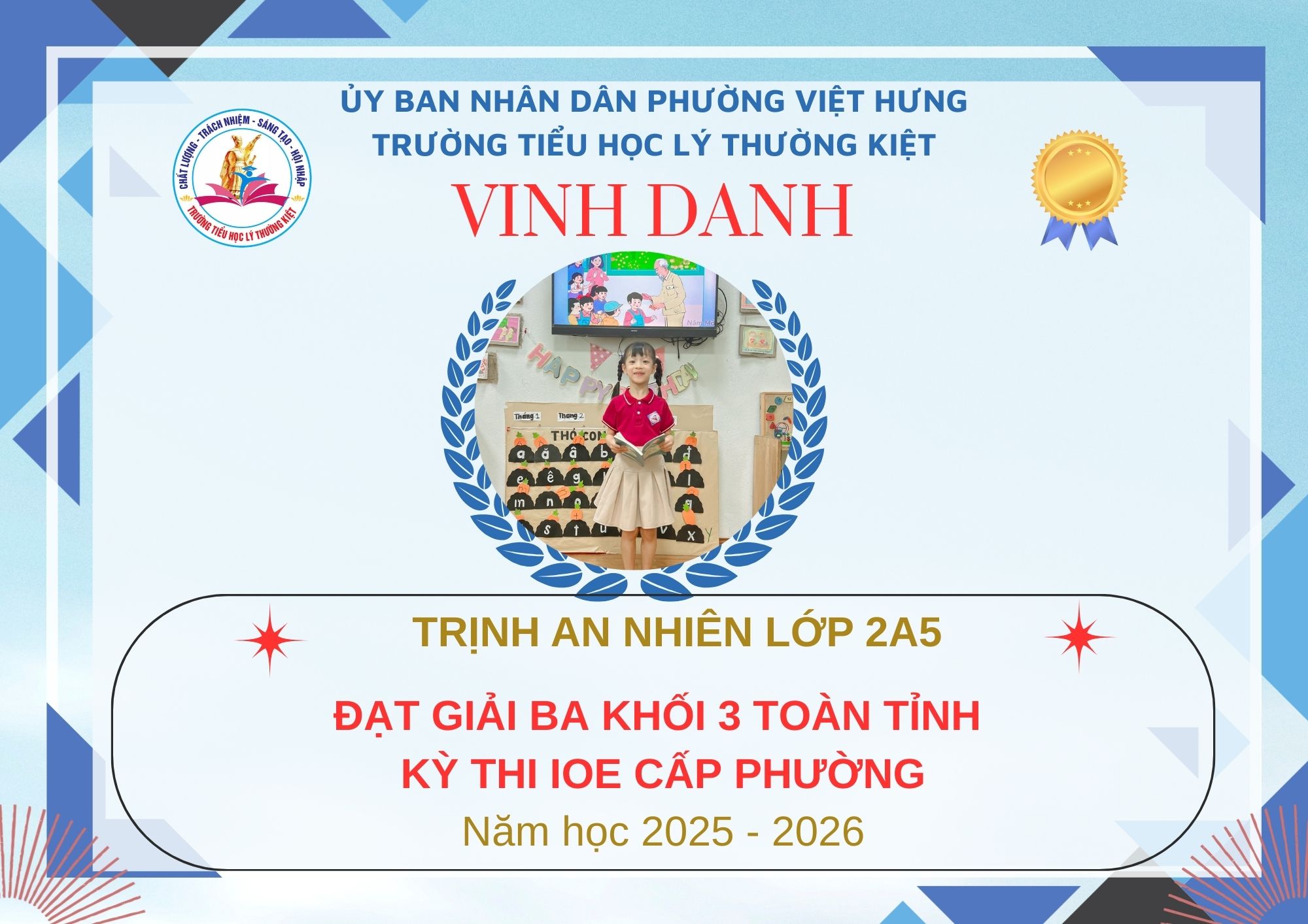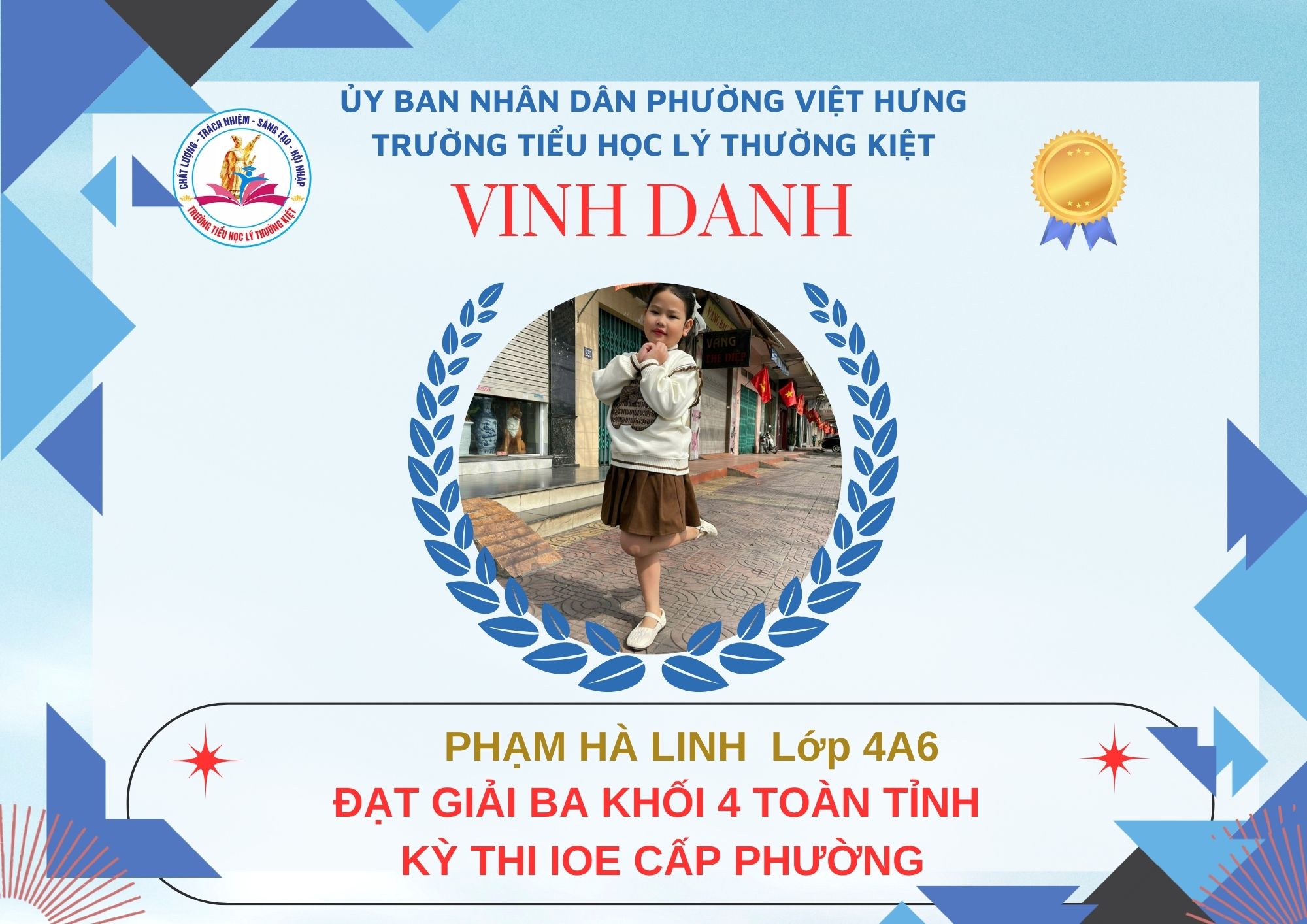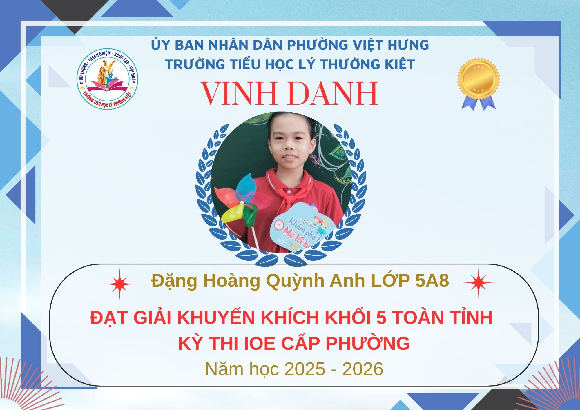 Không khí đón Tết Bính Ngọ càng thêm trọn vẹn khi Trường Tiểu học Lý Thường Kiệt vinh dự và tự hào được vinh danh với tổng số 61 giải trong kỳ thi Olympic Tiếng Anh trên Internet (IOE) cấp phường. Trong đó top Toàn Quốc là 08 giải và top Toàn Tỉnh là 53 giải. Đây là thành quả đáng tự hào của các em ghi nhận sự nỗ lực học tập không ngừng, tinh thần tự tin – chủ động – ham học hỏi của các em trong suốt quá trình ôn luyện và tham gia sân chơi trí tuệ bổ ích này.