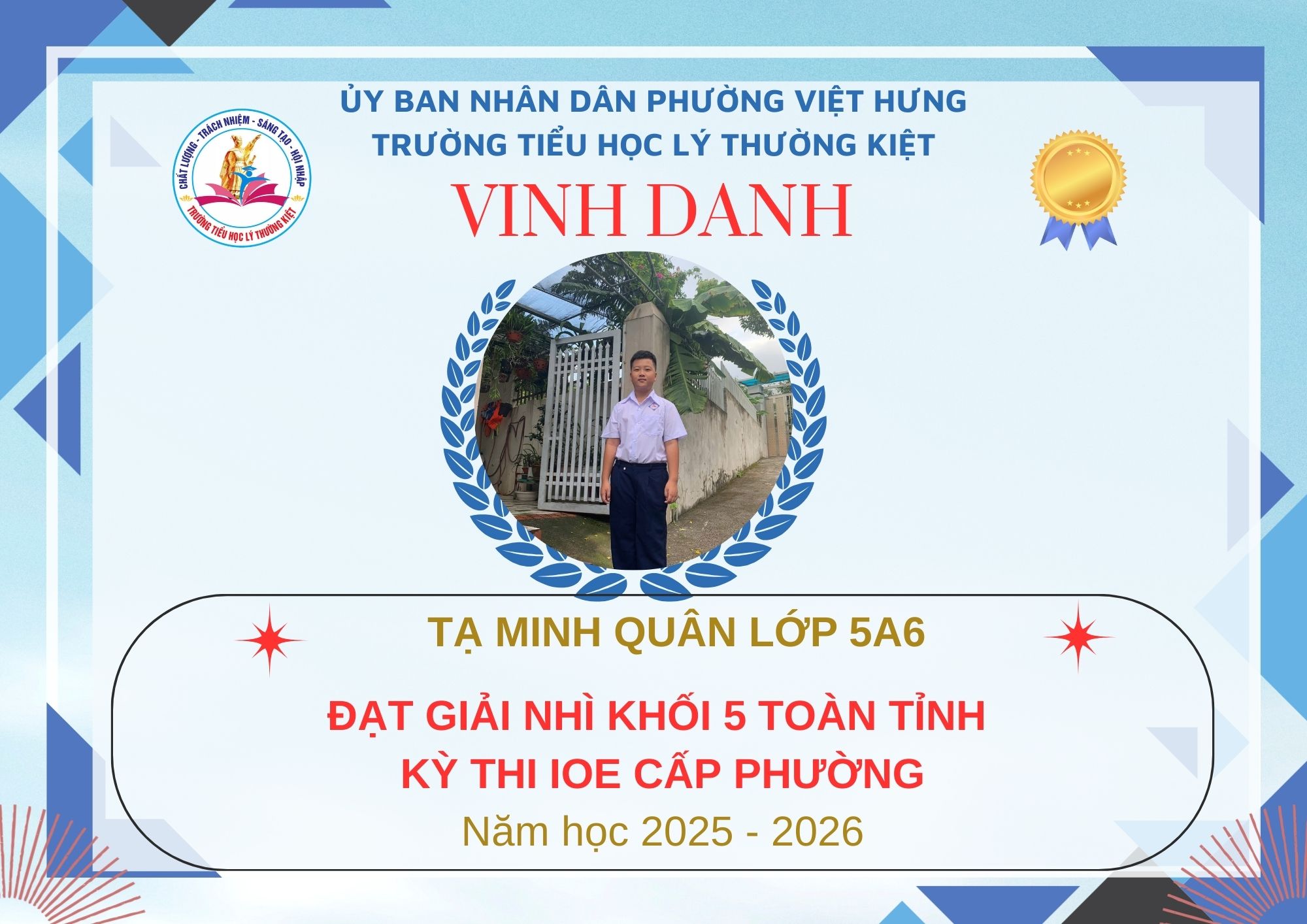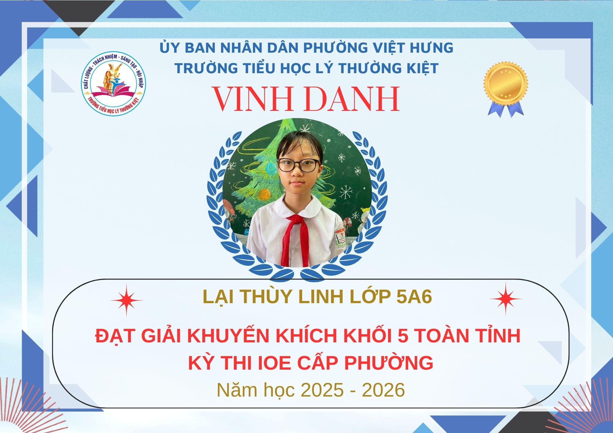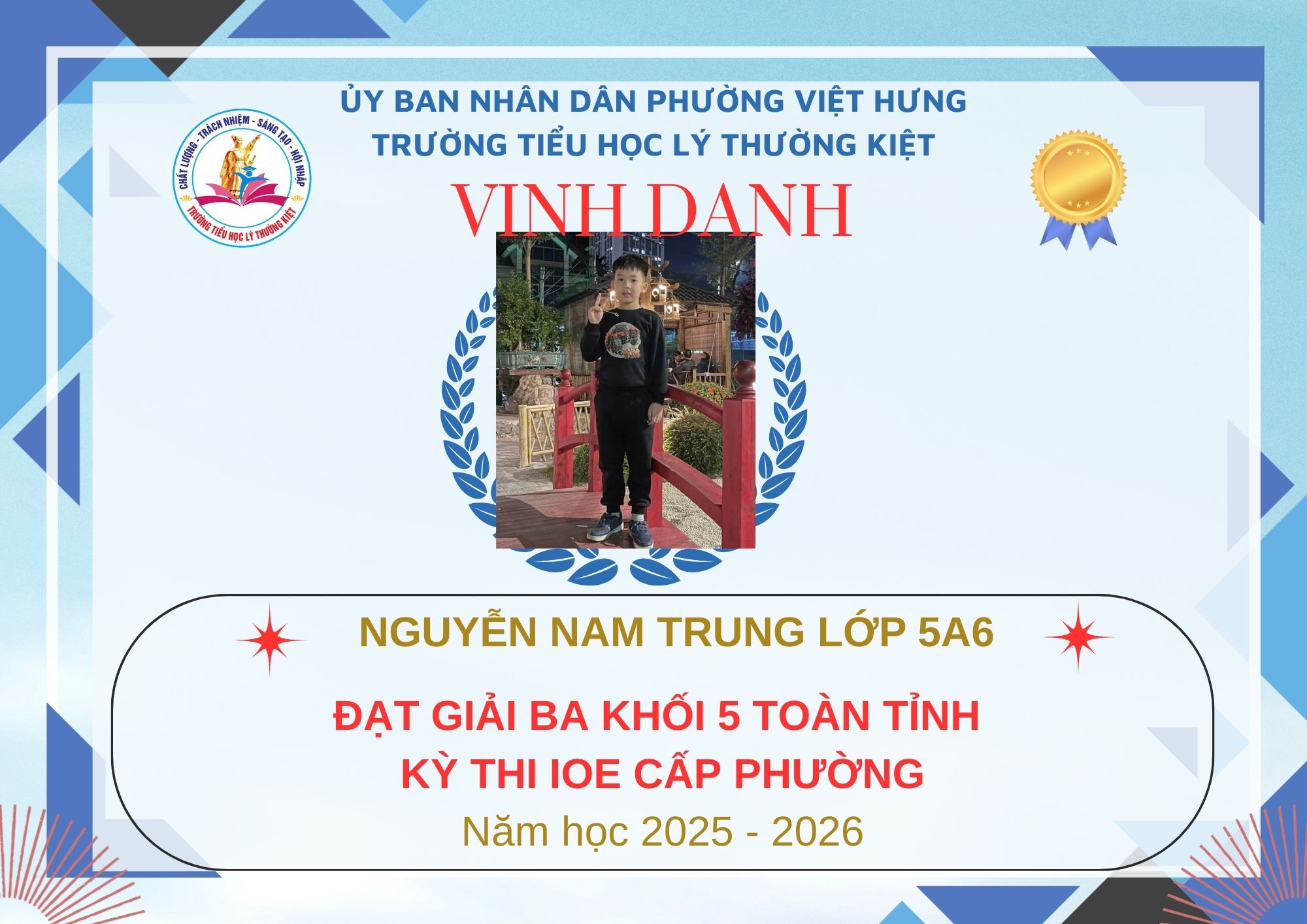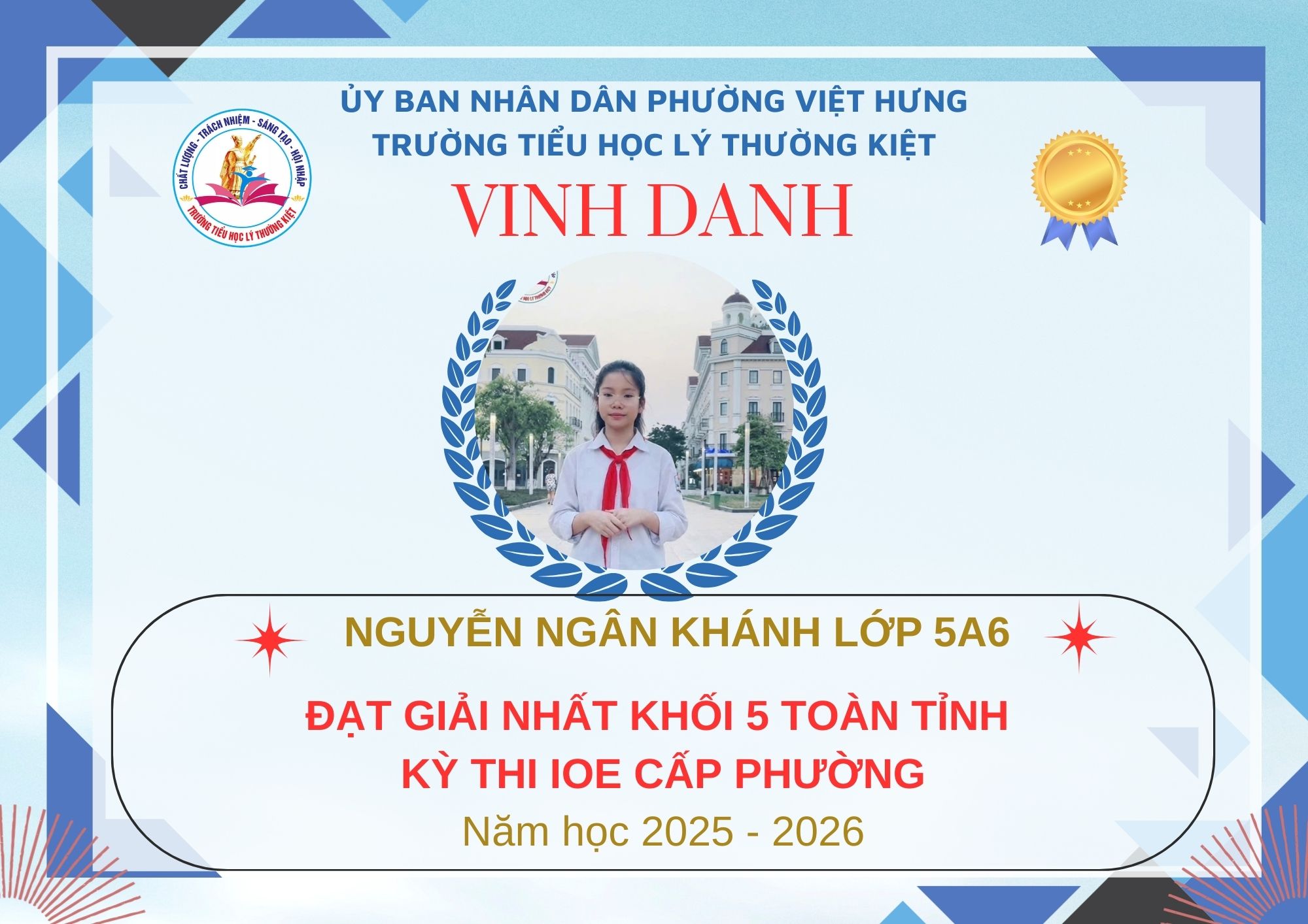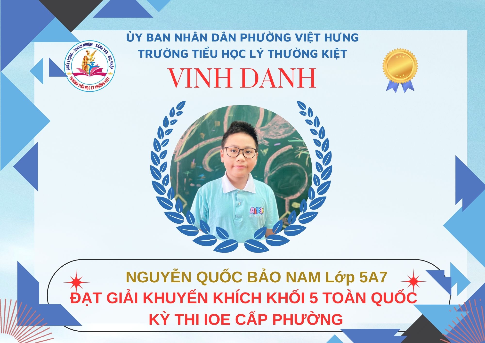Không khí đón Tết Bính Ngọ càng thêm trọn vẹn khi Trường Tiểu học Lý Thường Kiệt vinh dự và tự hào được vinh danh với tổng số 61 giải trong kỳ thi Olympic Tiếng Anh trên Internet (IOE) cấp phường. Trong đó top Toàn Quốc là 08 giải và top Toàn Tỉnh là 53 giải. Đây là thành quả đáng tự hào của các em ghi nhận sự nỗ lực học tập không ngừng, tinh thần tự tin – chủ động – ham học hỏi của các em trong suốt quá trình ôn luyện và tham gia sân chơi trí tuệ bổ ích này.