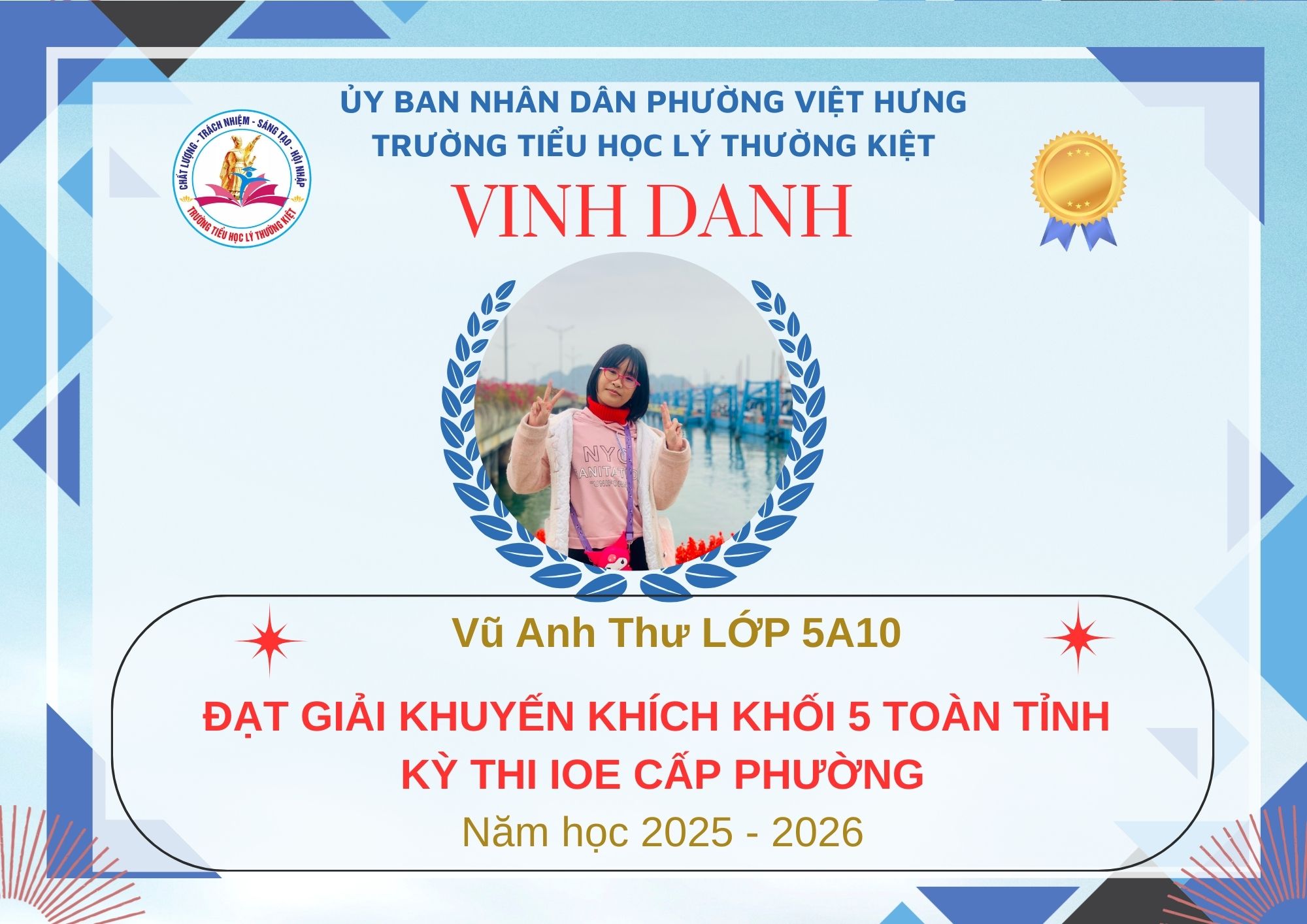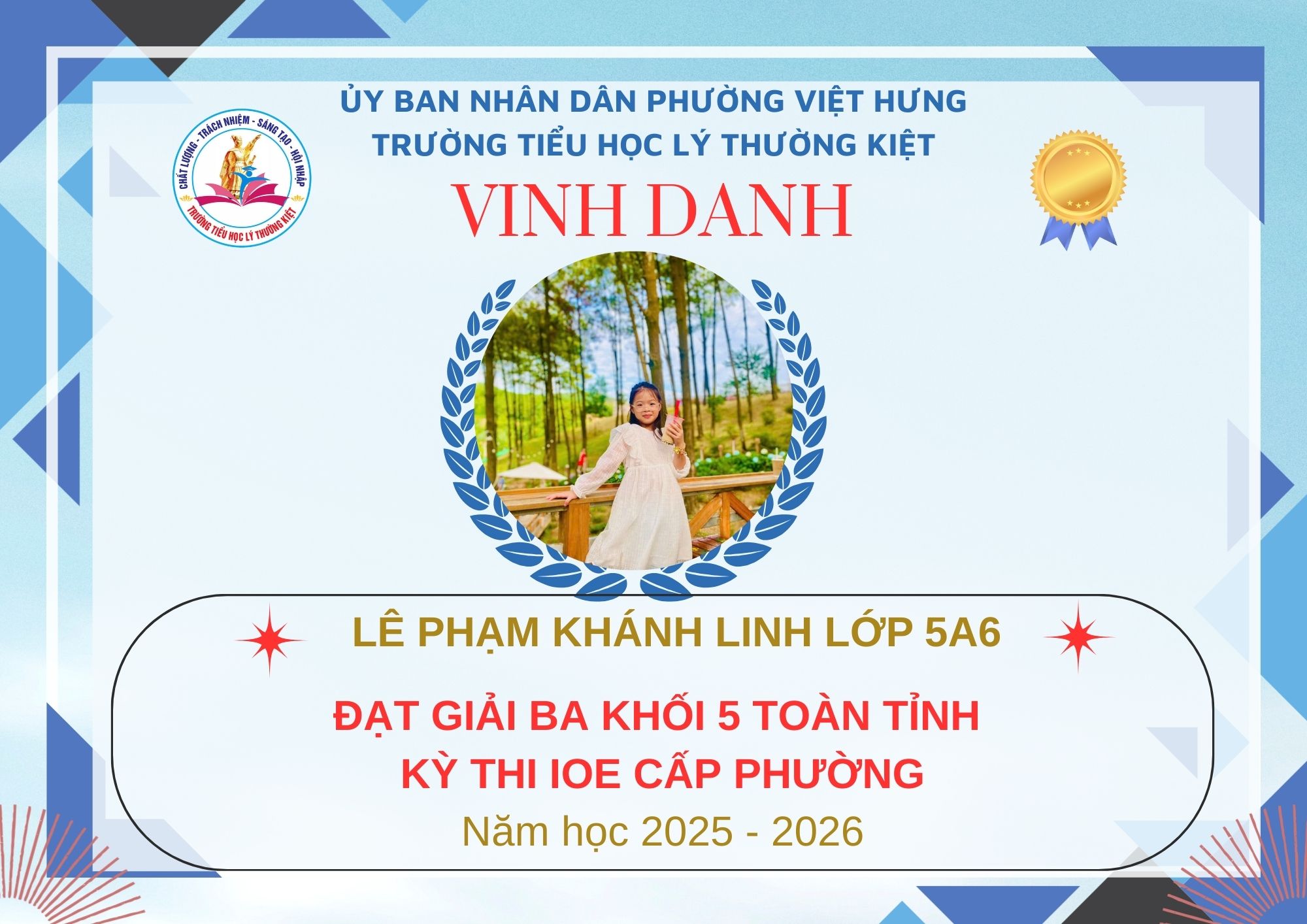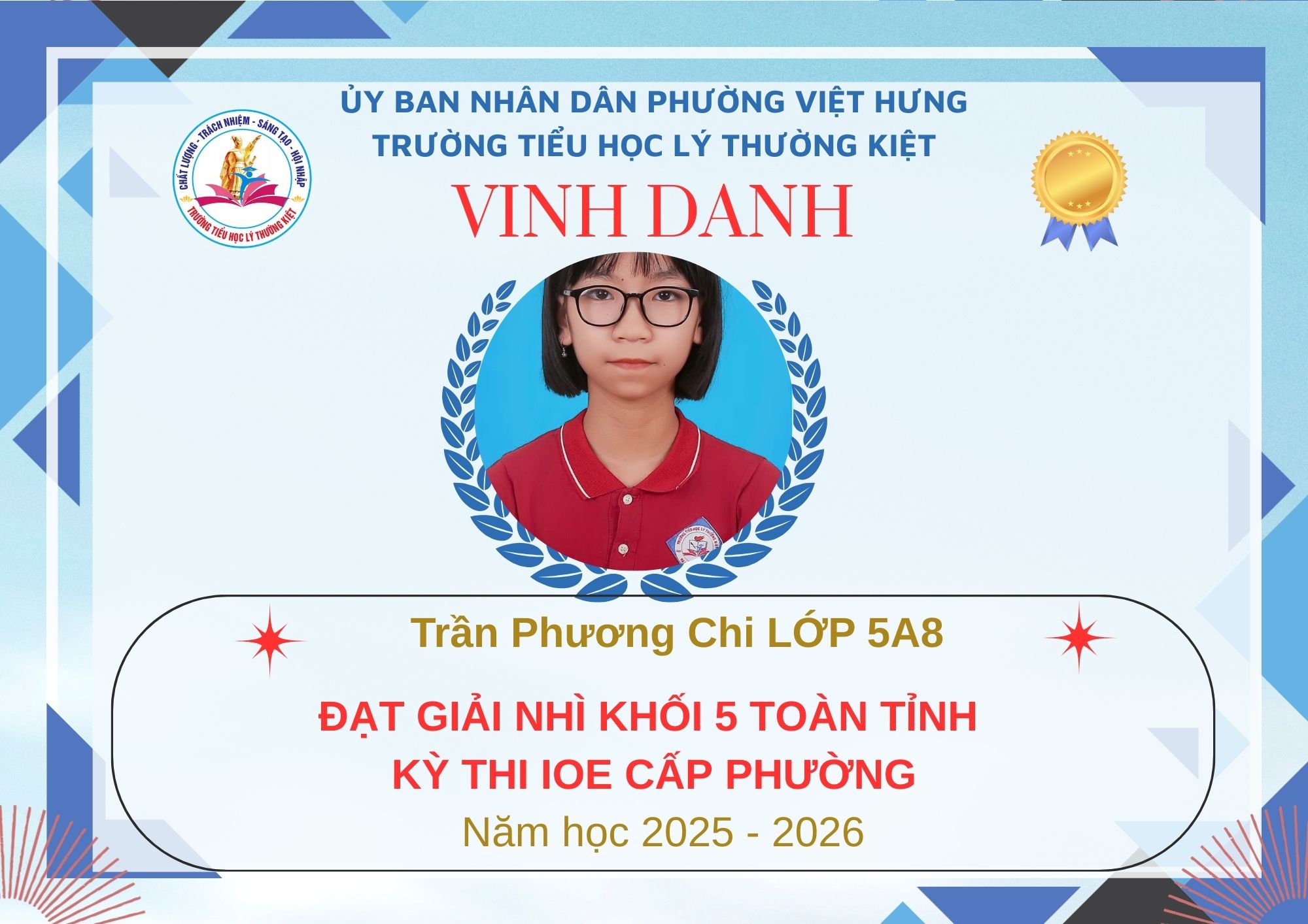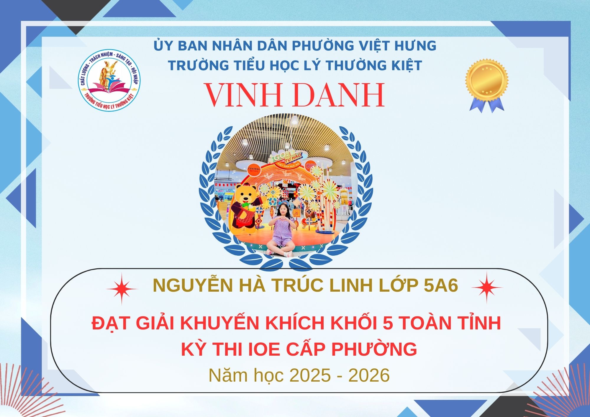 Không khí đón Tết Bính Ngọ càng thêm trọn vẹn khi Trường Tiểu học Lý Thường Kiệt vinh dự và tự hào được vinh danh với tổng số 61 giải trong kỳ thi Olympic Tiếng Anh trên Internet (IOE) cấp phường. Trong đó top Toàn Quốc là 08 giải và top Toàn Tỉnh là 53 giải. Đây là thành quả đáng tự hào của các em ghi nhận sự nỗ lực học tập không ngừng, tinh thần tự tin – chủ động – ham học hỏi của các em trong suốt quá trình ôn luyện và tham gia sân chơi trí tuệ bổ ích này.