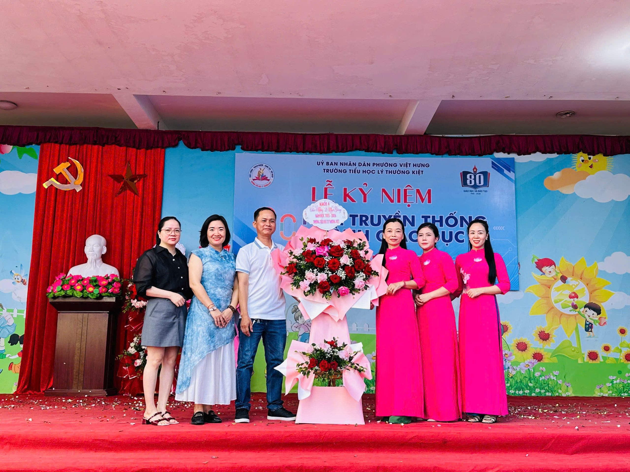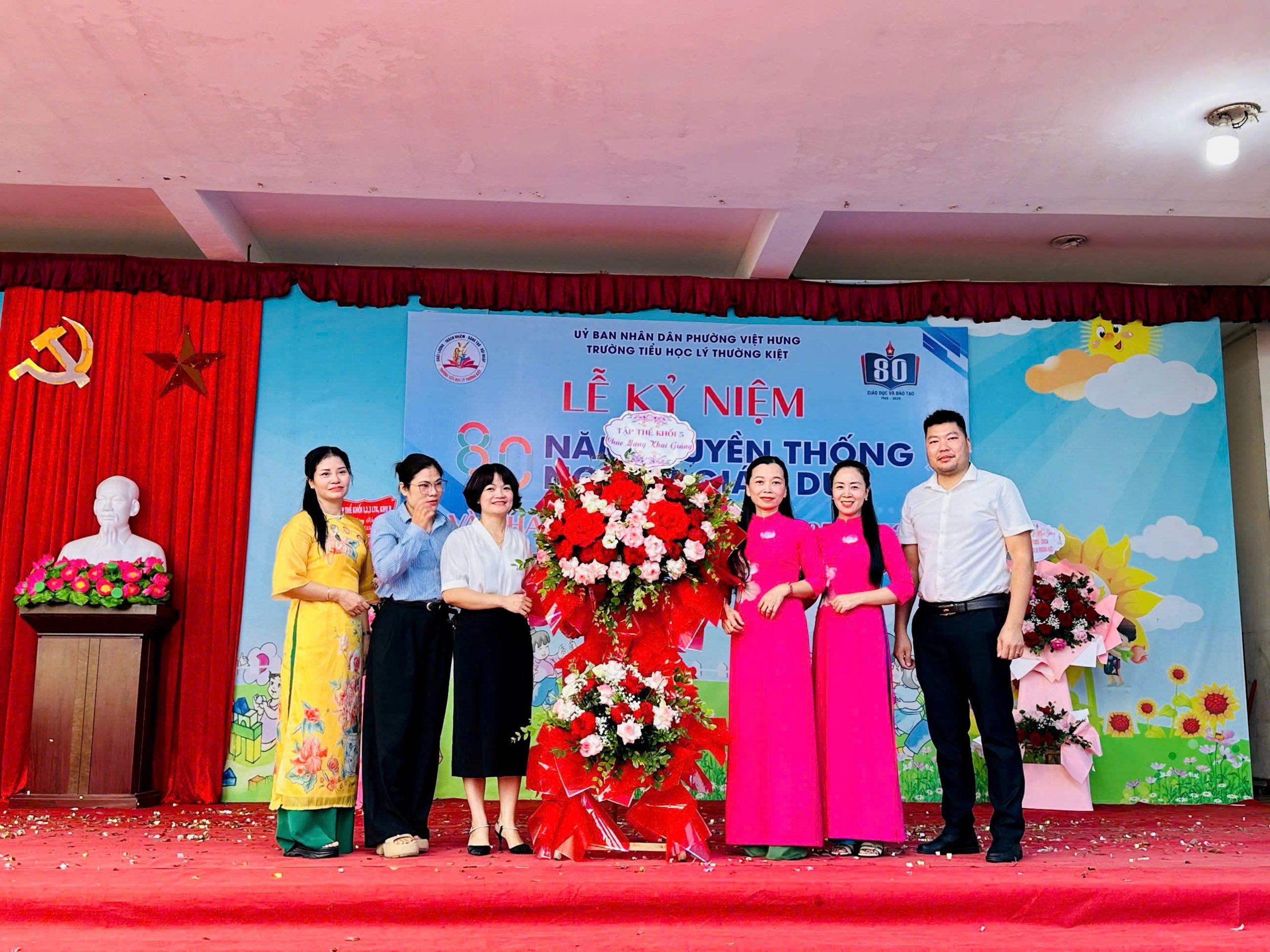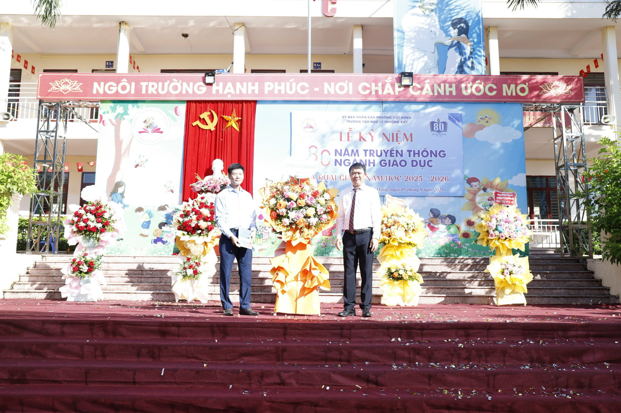 Đồng chí Vũ Ngọc Lâm – Bí thư Đảng ủy phường Việt Hưng, đ/c Nguyễn Thành Trung – Chánh văn phòng Đảng ủy phường Việt Hưng) dự và tặng hoa chúc mừng trong buổi lễ khai giảng
