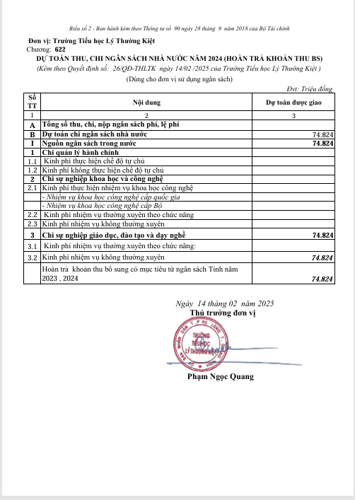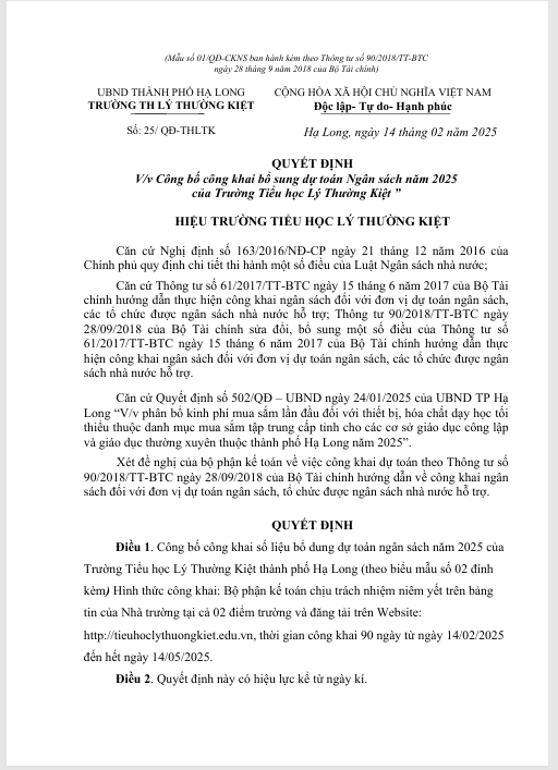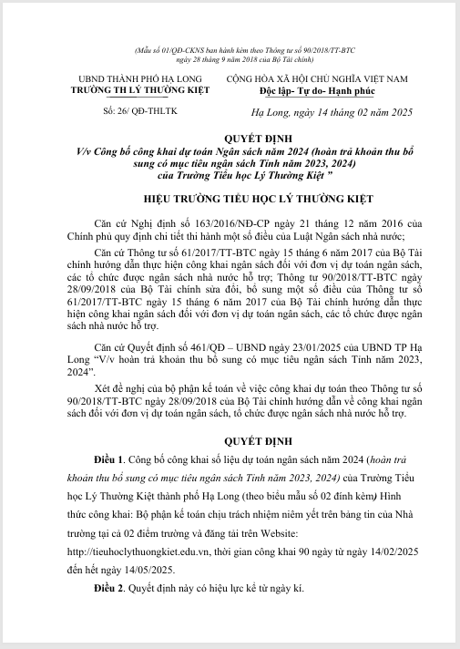 CÔNG BỐ CÔNG KHAI DỰ TOÁN NGÂN SÁCH NĂM 2024 VÀ CÔNG KHAI BỔ SUNG DỰ TOÁN NGÂN SÁCH NĂM 2025Công khai, Tin nổi bật, Tin tổng hợp Công bố công khai dự toán ngân sách năm 2024 và công khai bổ sung dự toán ngân sách năm 2025 Có thể bạn quan tâm: ☭⭐RỘN RÀNG KHÍ THẾ “TIẾP BƯỚC CHA ANH” – SINH HOẠT CHUYÊN ĐỀ CHÀO MỪNG 96 NĂM NGÀY THÀNH LẬP ĐẢNG☭⭐ 🌟CHÀO MỪNG THÀNH CÔNG ĐẠI HỘI XIV: VỮNG BƯỚC VÀO KỶ NGUYÊN VƯƠN MÌNH 🌟 🌸🌸🌸NÔ NỨC ĐÓN XUÂN 2026 VỚI BẢNG THÀNH TÍCH RỰC RỠ CỦA CÁC EM HỌC SINH TRƯỜNG TIỂU HỌC LÝ THƯỜNG KIỆT TẠI CUỘC THI OLYMPIC TIẾNG ANH TRÊN INTERNET (IOE) CẤP PHƯỜNG NĂM HỌC 2025 – 2026🌸🌸🌸 Để lại một bình luận HủyEmail của bạn sẽ không được hiển thị công khai. Các trường bắt buộc được đánh dấu *Bình luận * Tên * Email * Trang web Lưu tên của tôi, email, và trang web trong trình duyệt này cho lần bình luận kế tiếp của tôi.