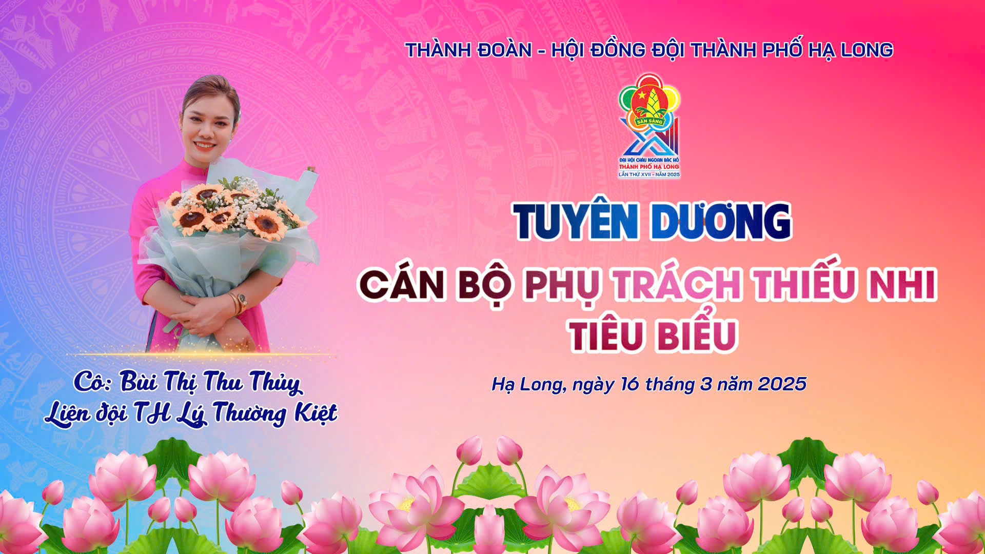 Bên cạnh những gương mặt tiêu biểu của thiếu nhi thành phố, đại hội cũng tuyên dương cô Bùi Thị Thu Thủy, cán bộ phụ trách thiếu nhi, Liên đội Trường Tiểu học Lý Thường Kiệt. Với tâm huyết và trách nhiệm, cô Thủy đã góp phần quan trọng trong việc hướng dẫn, dìu dắt các thế hệ học sinh, triển khai hiệu quả phong trào “Thiếu nhi Hạ Long thi đua thực hiện tốt 5 điều Bác Hồ dạy” tại nhà trường. Nhờ sự tận tụy của cô, các em học sinh không chỉ có thành tích học tập tốt mà còn tích cực tham gia các hoạt động Đội, rèn luyện ý thức đạo đức và trách nhiệm với cộng đồng.