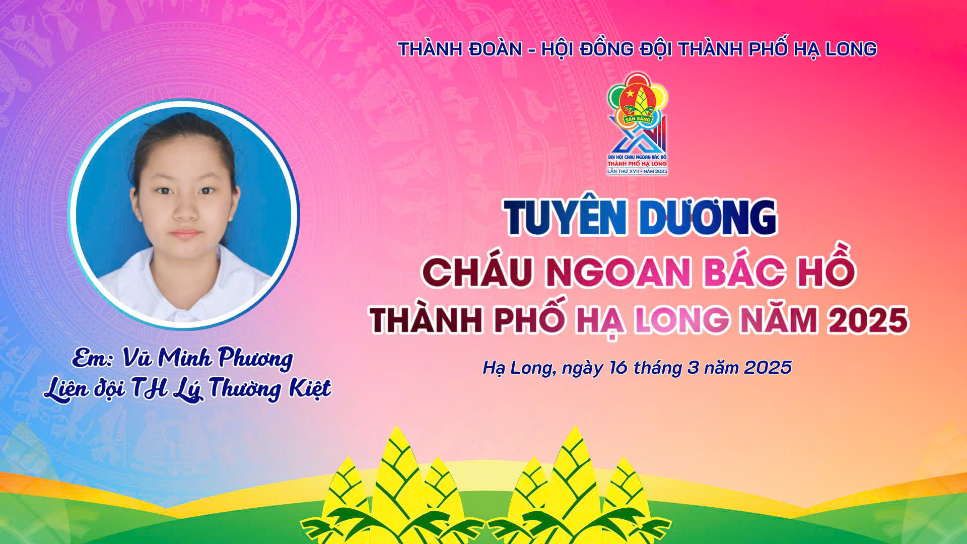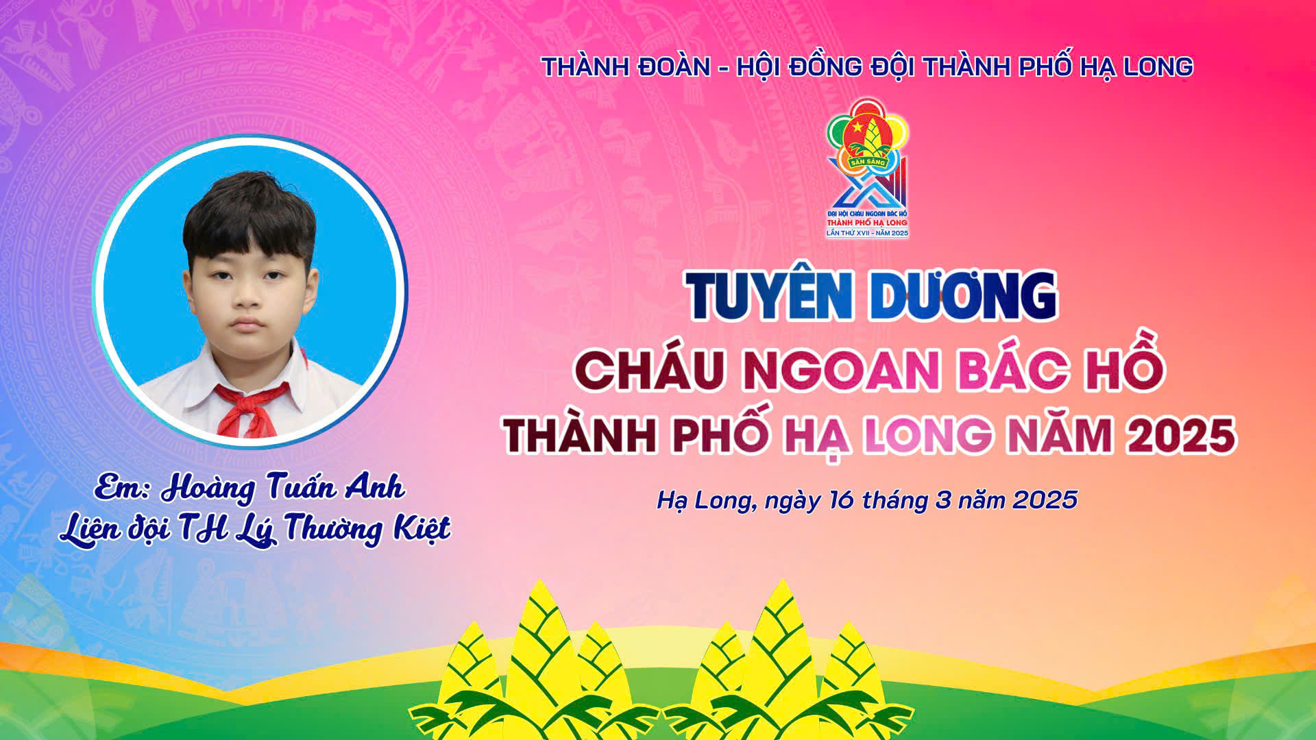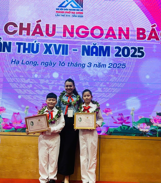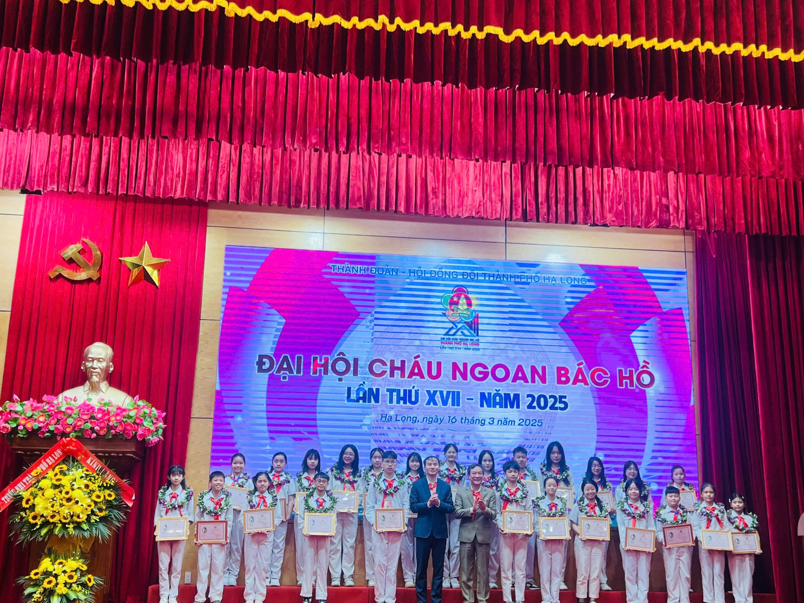 Ngày 16 tháng 3 năm 2025, tại thành phố Hạ Long, đã diễn ra Đại hội Cháu ngoan Bác Hồ lần thứ XVII, một sự kiện trọng đại nhằm tôn vinh những học sinh xuất sắc và cán bộ phụ trách Đội tiêu biểu. Đại hội là dịp để biểu dương những tấm gương tiêu biểu trong phong trào thi đua, đặc biệt hưởng ứng cuộc vận động “Thiếu nhi Hạ Long thi đua thực hiện tốt 5 điều Bác Hồ dạy”. Đây không chỉ là cơ hội để ghi nhận sự cố gắng của các em thiếu nhi mà còn là động lực để các em tiếp tục phấn đấu, rèn luyện và trưởng thành.