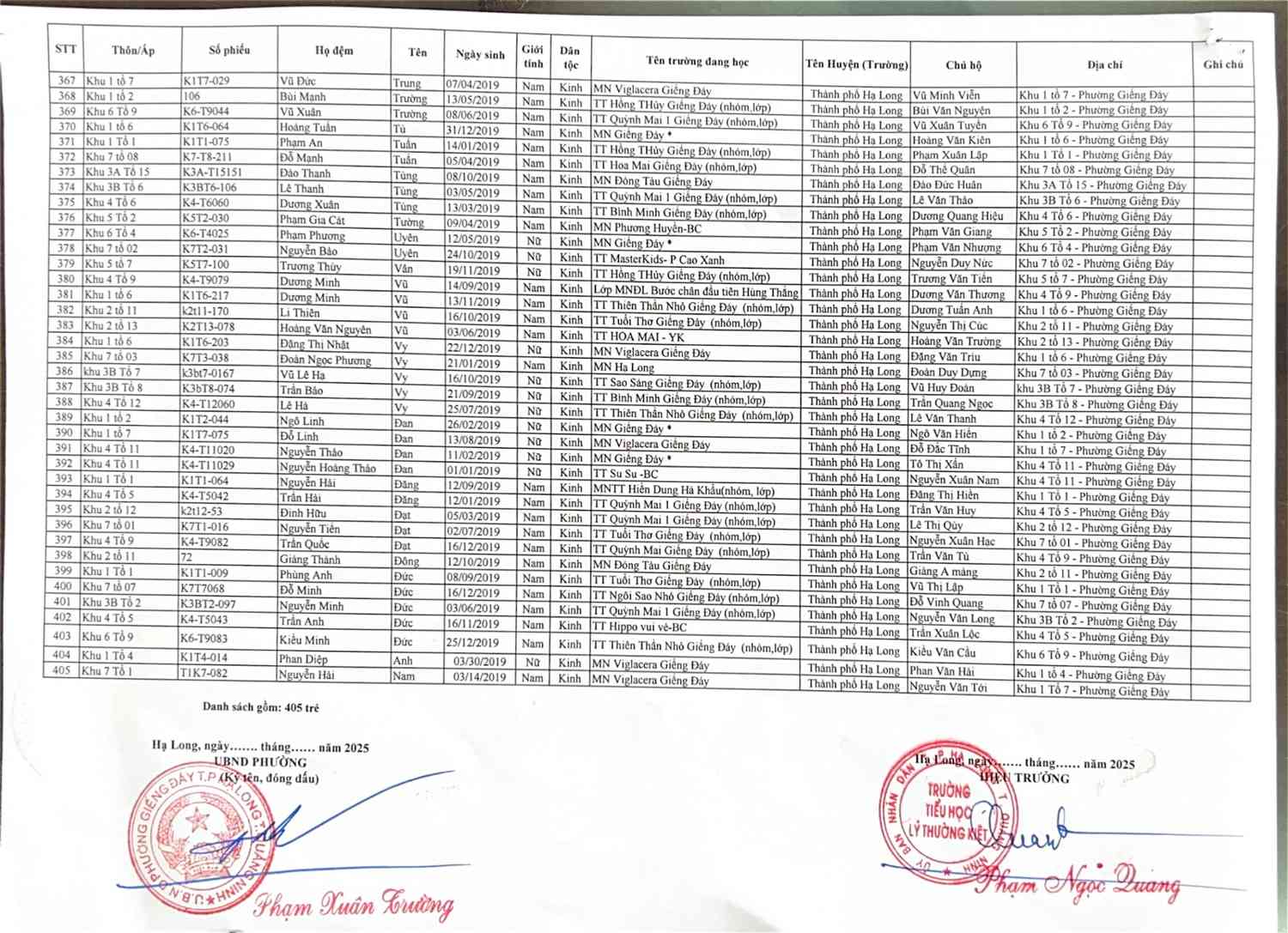 DANH SÁCH TRẺ SINH NĂM 2019 THEO SỐ LIỆU ĐIỀU TRA PHỔ CẬP NĂM 2024 ĐỦ ĐIỀU KIỆN THAM GIA TUYỂN SINH LỚP 1 NĂM HỌC 2025-2026 TẠI TRƯỜNG TH LÝ THƯỜNG KIỆT