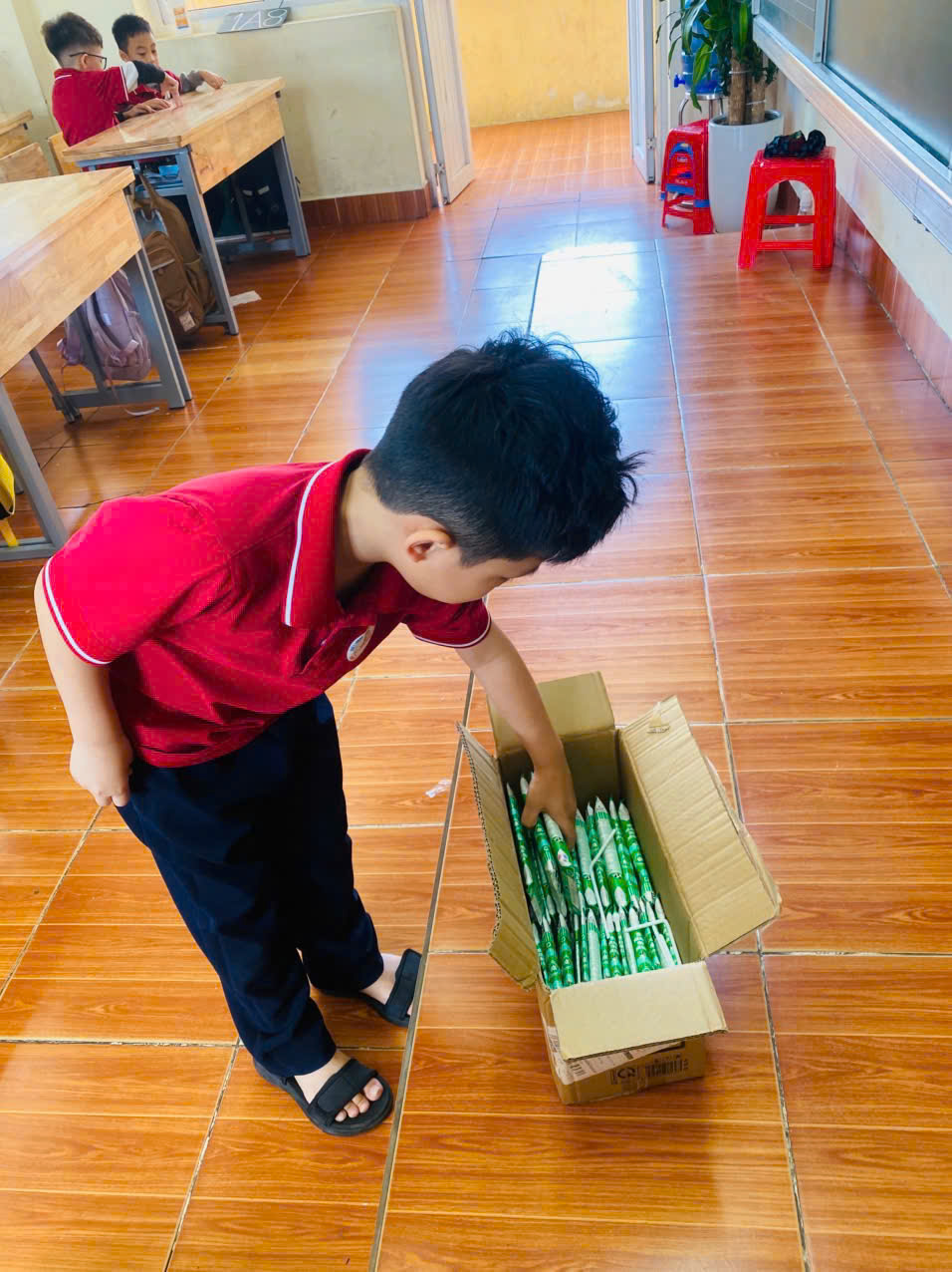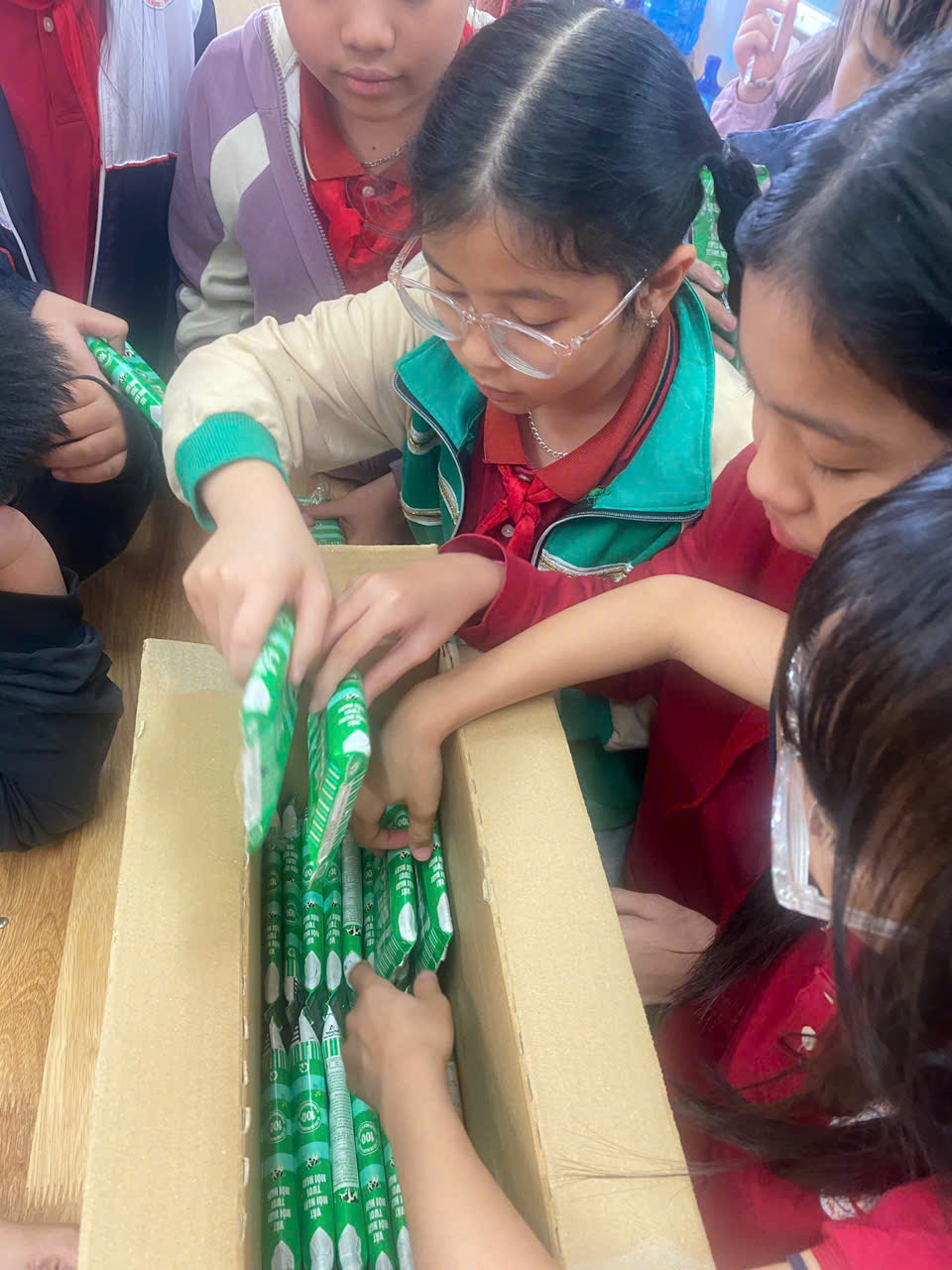 ✨ Dưới đây là một số hình ảnh đáng yêu của các em học sinh trong hoạt động thu gom vỏ hộp sữa: