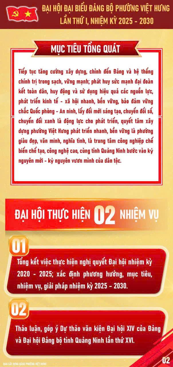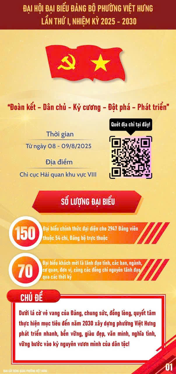 Với tinh thần “Đoàn kết – Kỷ cương – Sáng tạo – Phát triển”, Đại hội đại biểu Đảng bộ phường Việt Hưng lần thứ Nhất, nhiệm kỳ 2025 – 2030 sẽ là dịp khẳng định quyết tâm xây dựng phường Việt Hưng trở thành địa phương phát triển năng động, văn minh, hiện đại và nghĩa tình.