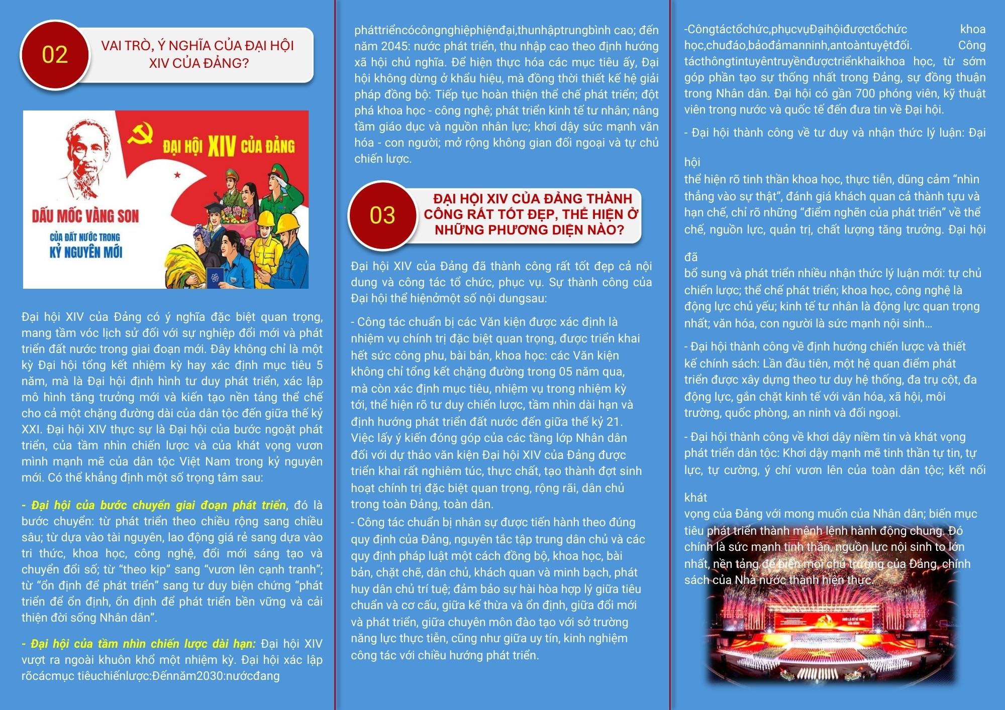 🔹 Sự kiện mang tầm vóc lịch sử: Đại hội XIV của Đảng họp từ ngày 19/01/2026 đến ngày 23/01/2026 tại Thủ đô Hà Nội. Đây là Đại hội của ý chí tự chủ chiến lược, tự hào dân tộc và khát vọng vươn lên mạnh mẽ. Đại hội thực sự là bước ngoặt phát triển, khơi dậy niềm tin của toàn Đảng, toàn dân vào kỷ nguyên mới.