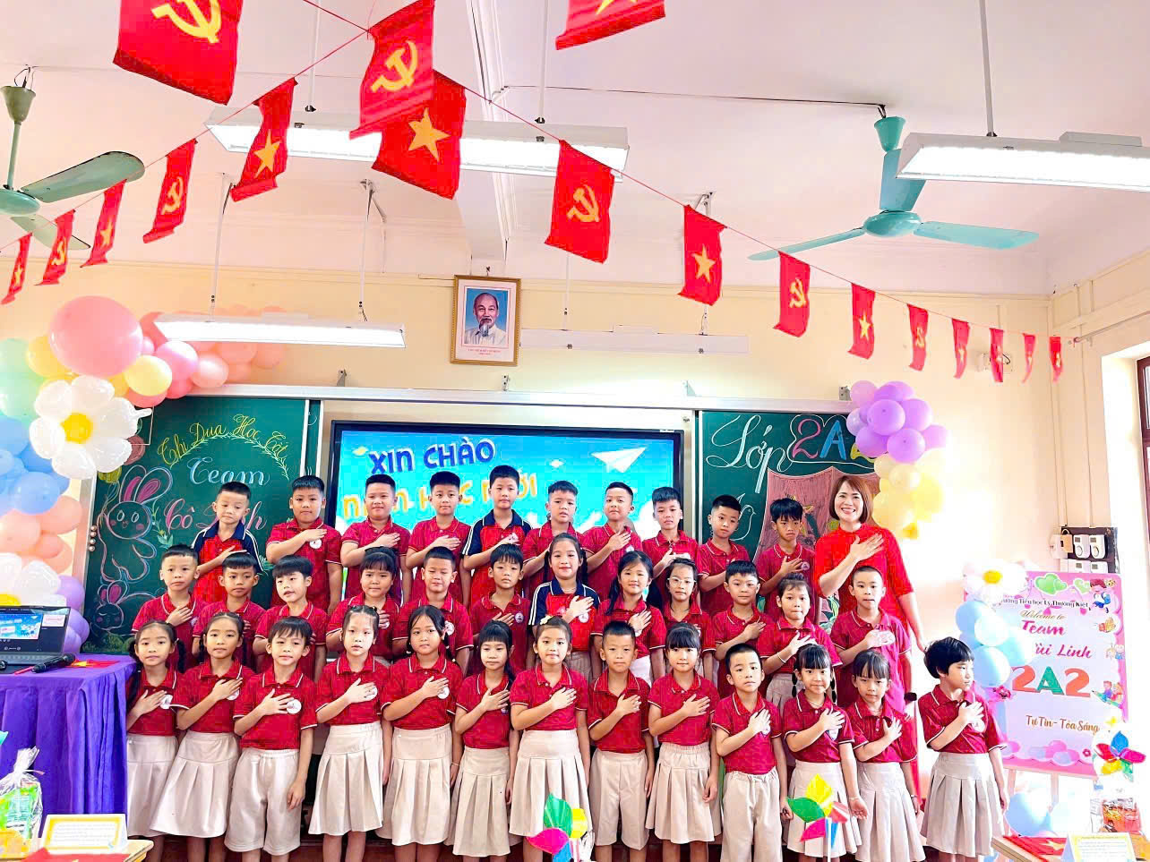Trong ngày tựu trường, hình ảnh các em học sinh hồn nhiên trong bộ đồng phục đỏ tươi, khoác trên mình màu cờ đỏ sao vàng và rộn ràng tung bay lá cờ Tổ quốc là biểu tượng đẹp đẽ của lòng yêu nước, của niềm tin và khát vọng hòa bình.