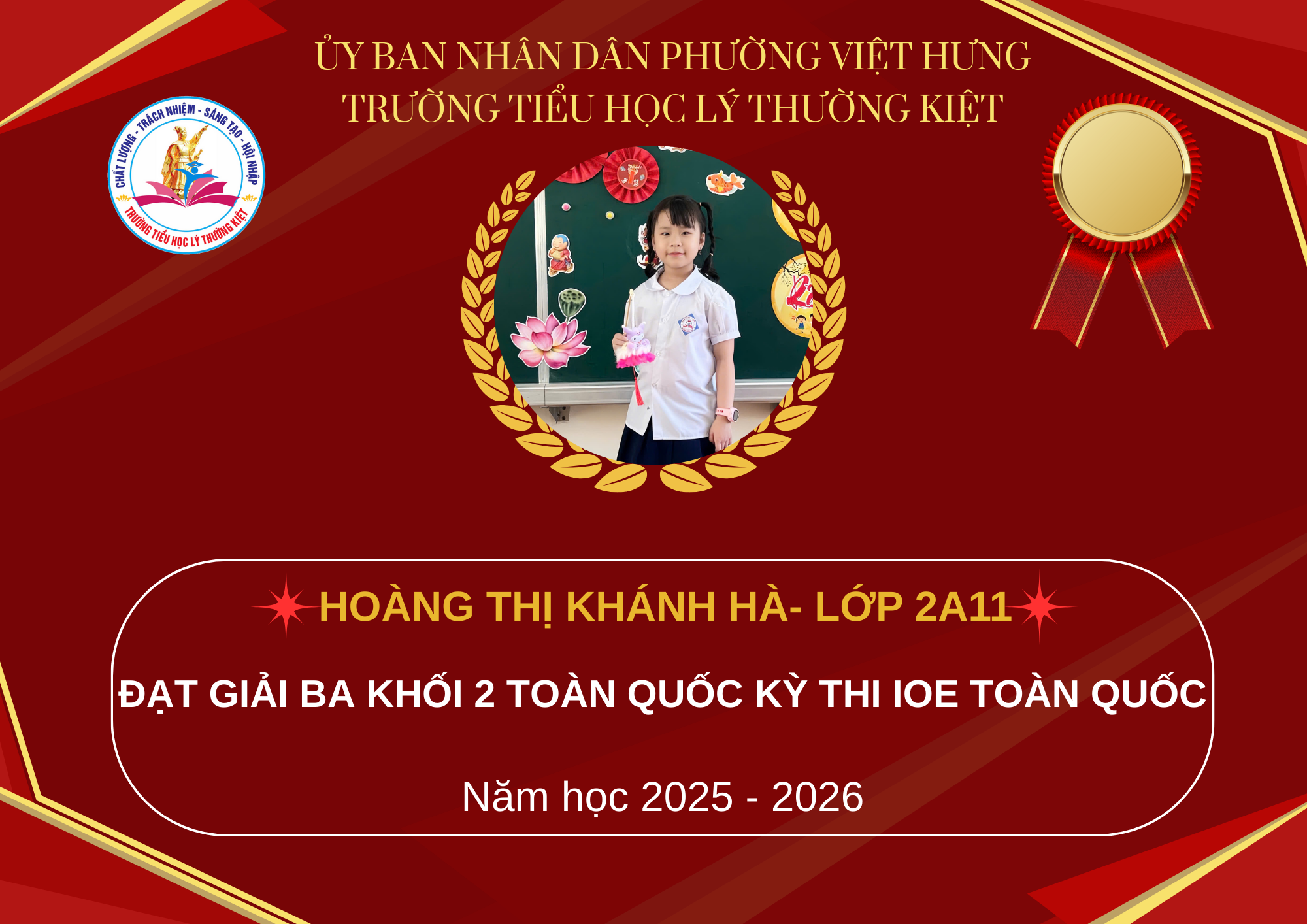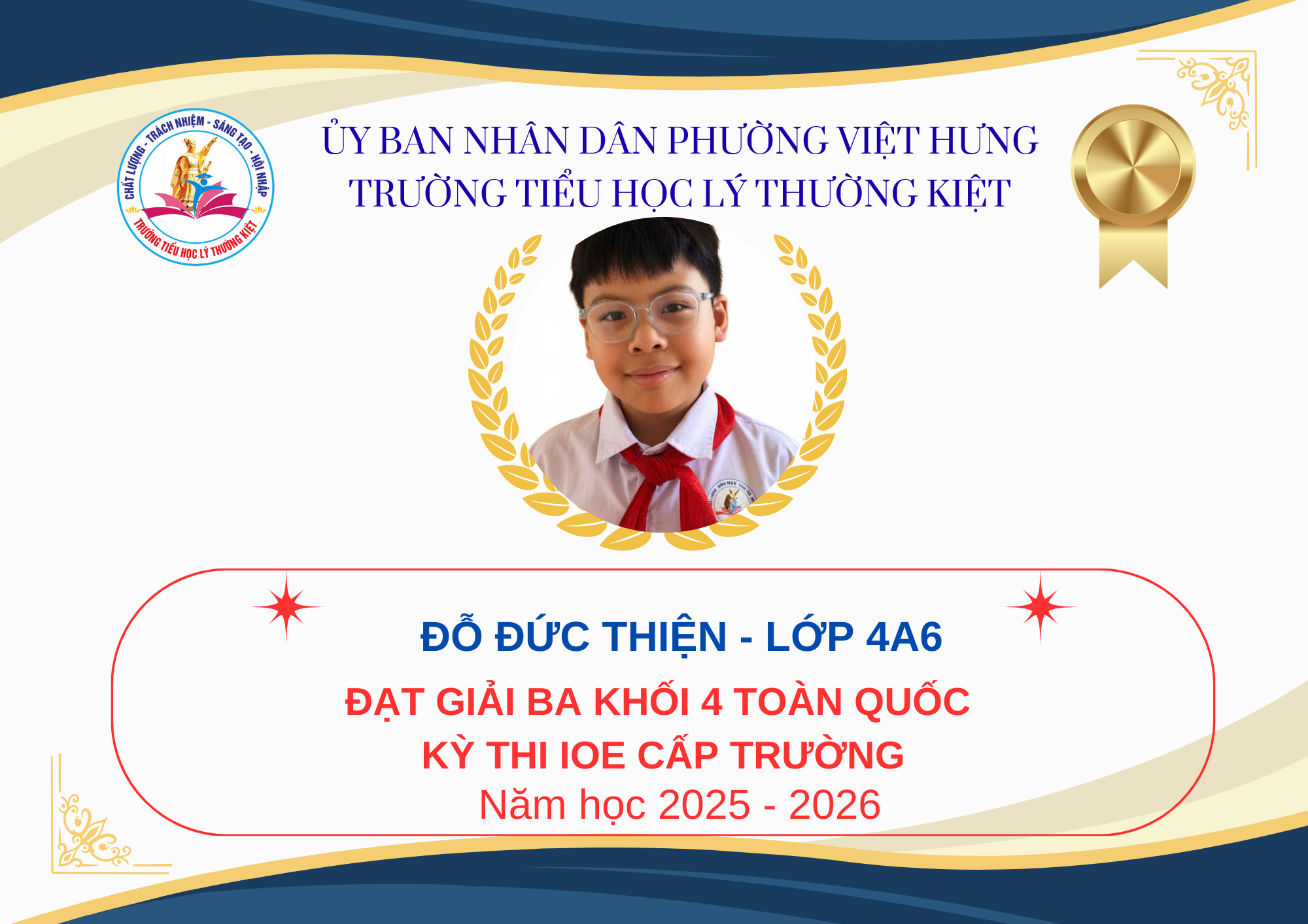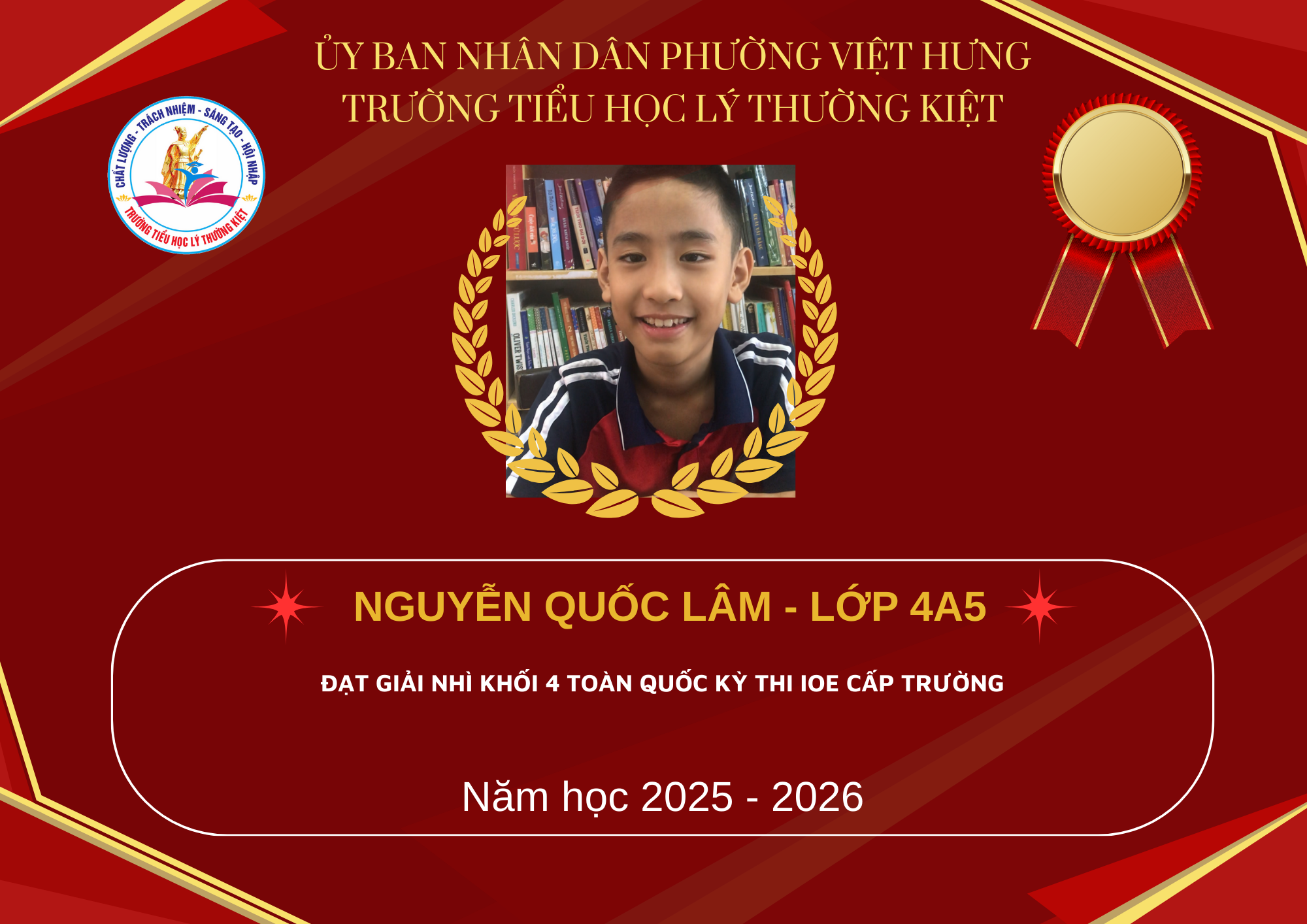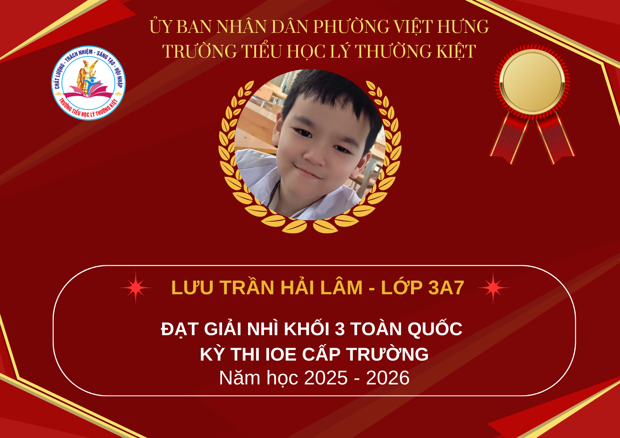 Trước hết, Trường Tiểu học Lý Thường Kiệt xin trân trọng vinh danh và nhiệt liệt chúc mừng các em học sinh đã xuất sắc đạt giải trong kỳ thi IOE cấp Quốc gia.
