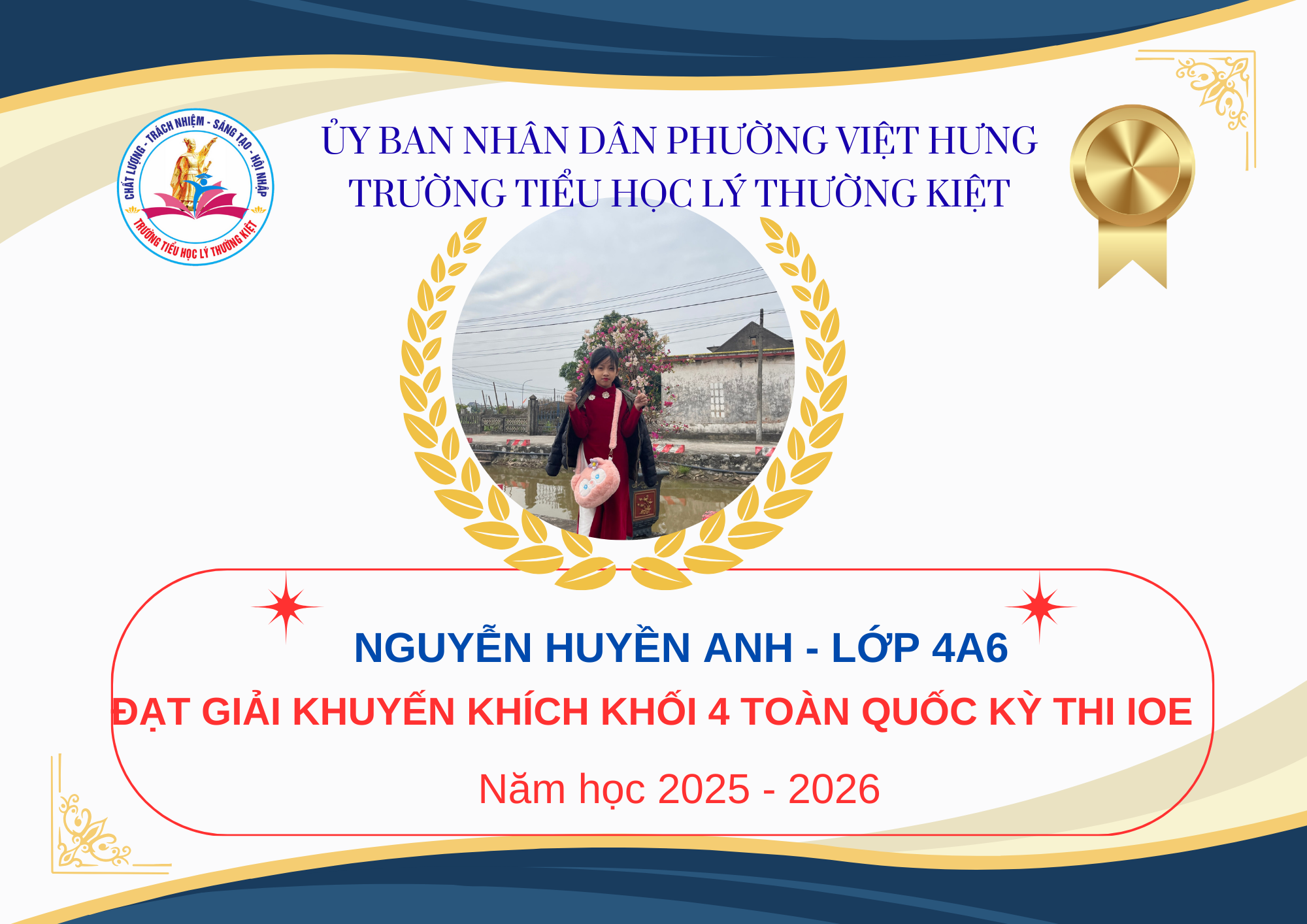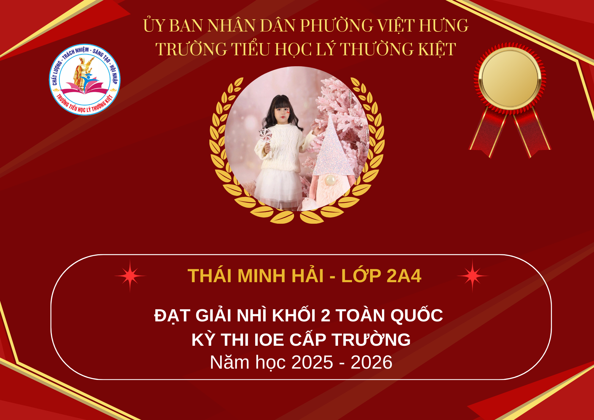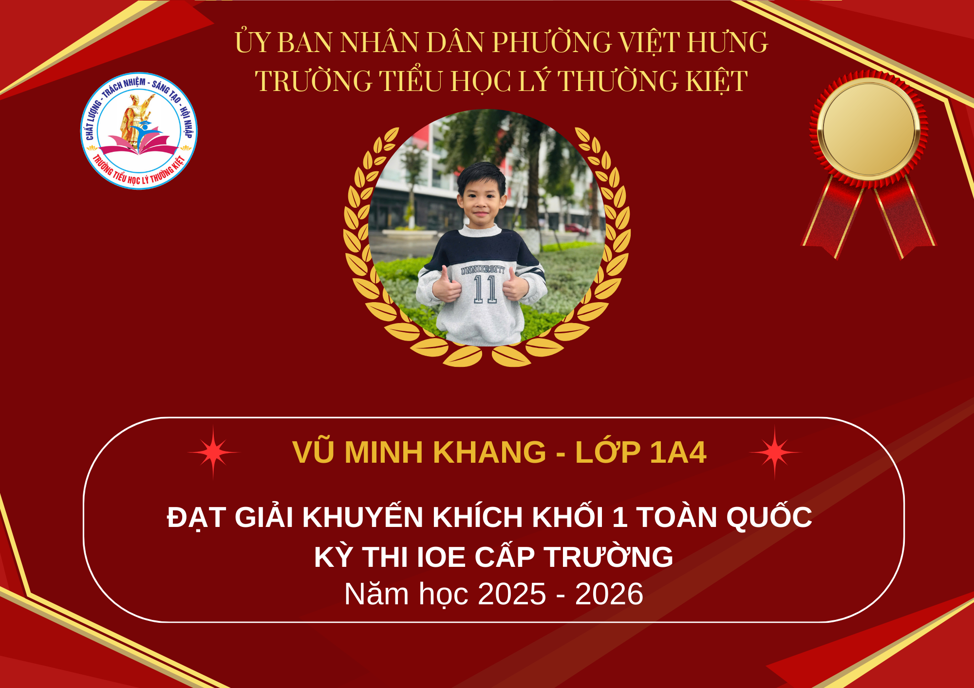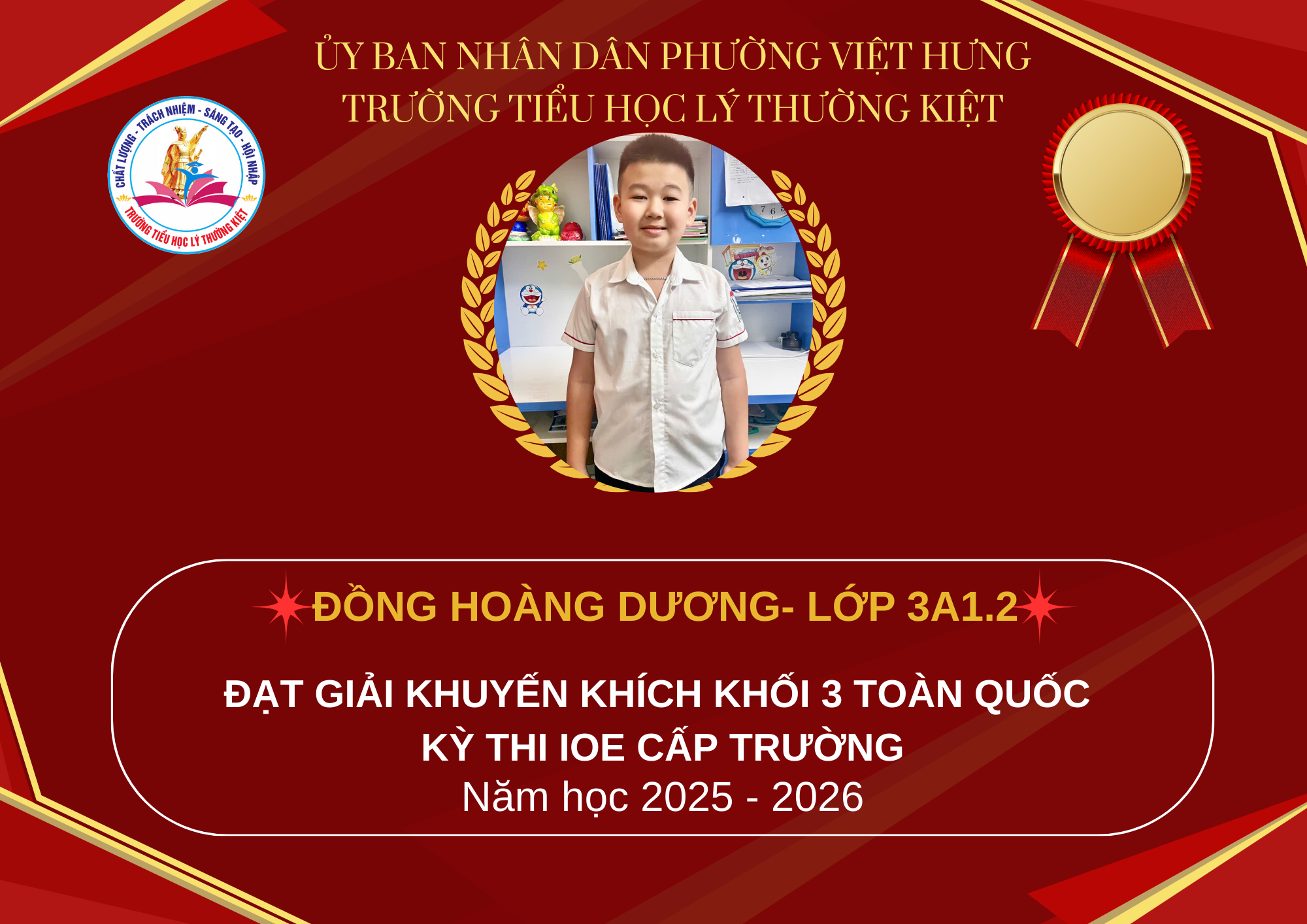 Trước hết, Trường Tiểu học Lý Thường Kiệt xin trân trọng vinh danh và nhiệt liệt chúc mừng các em học sinh đã xuất sắc đạt giải trong kỳ thi IOE cấp Quốc gia.