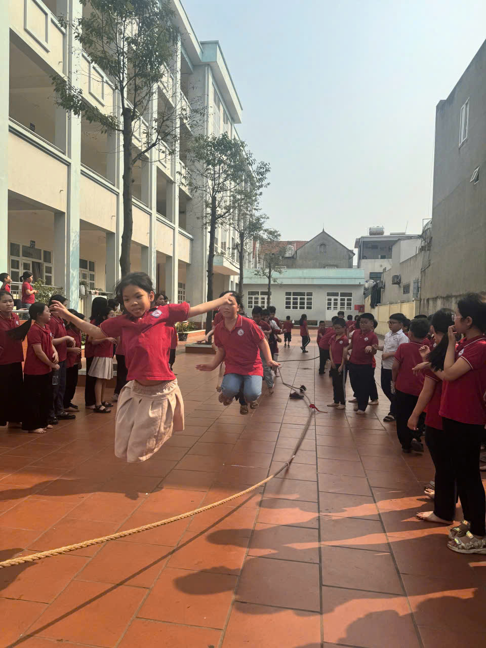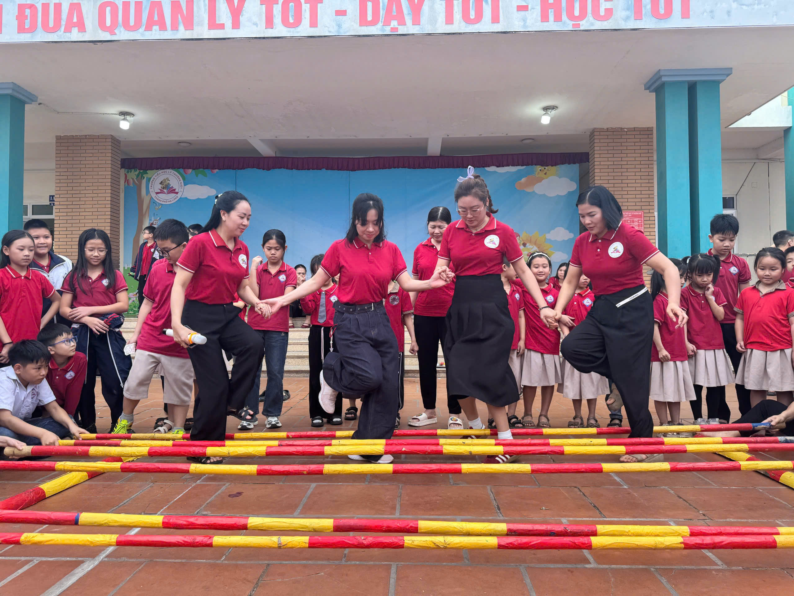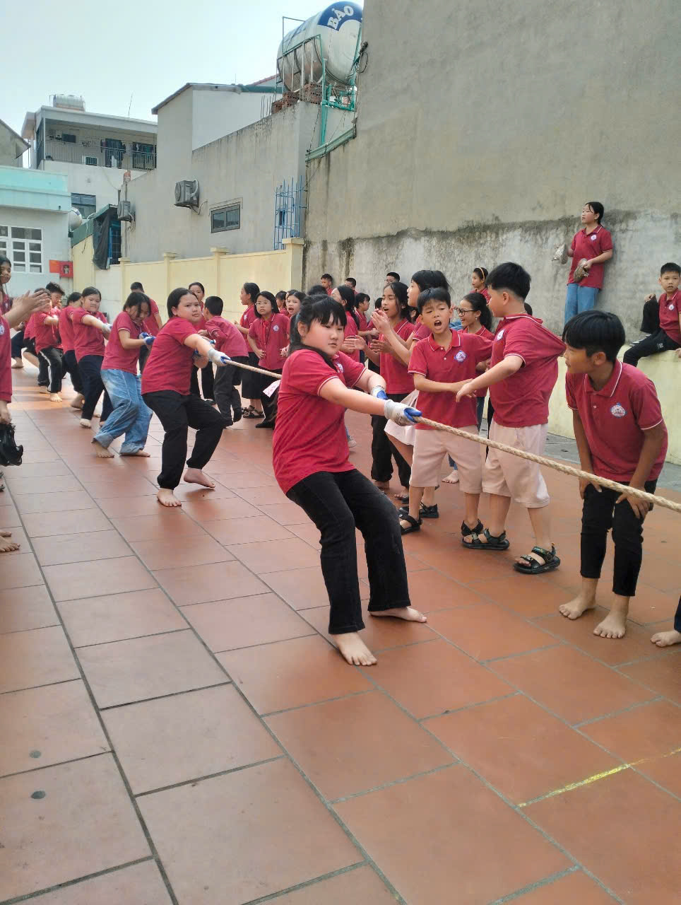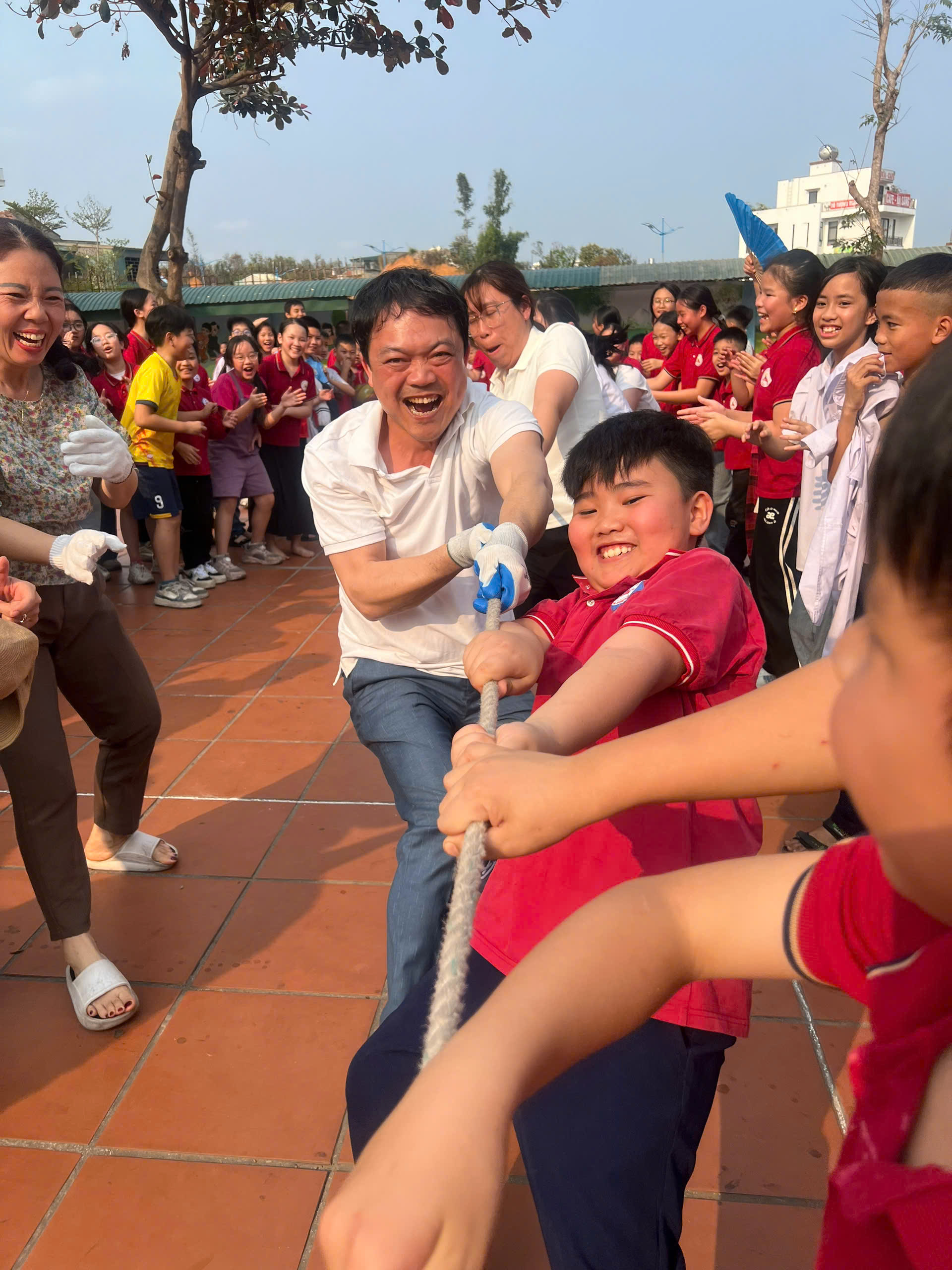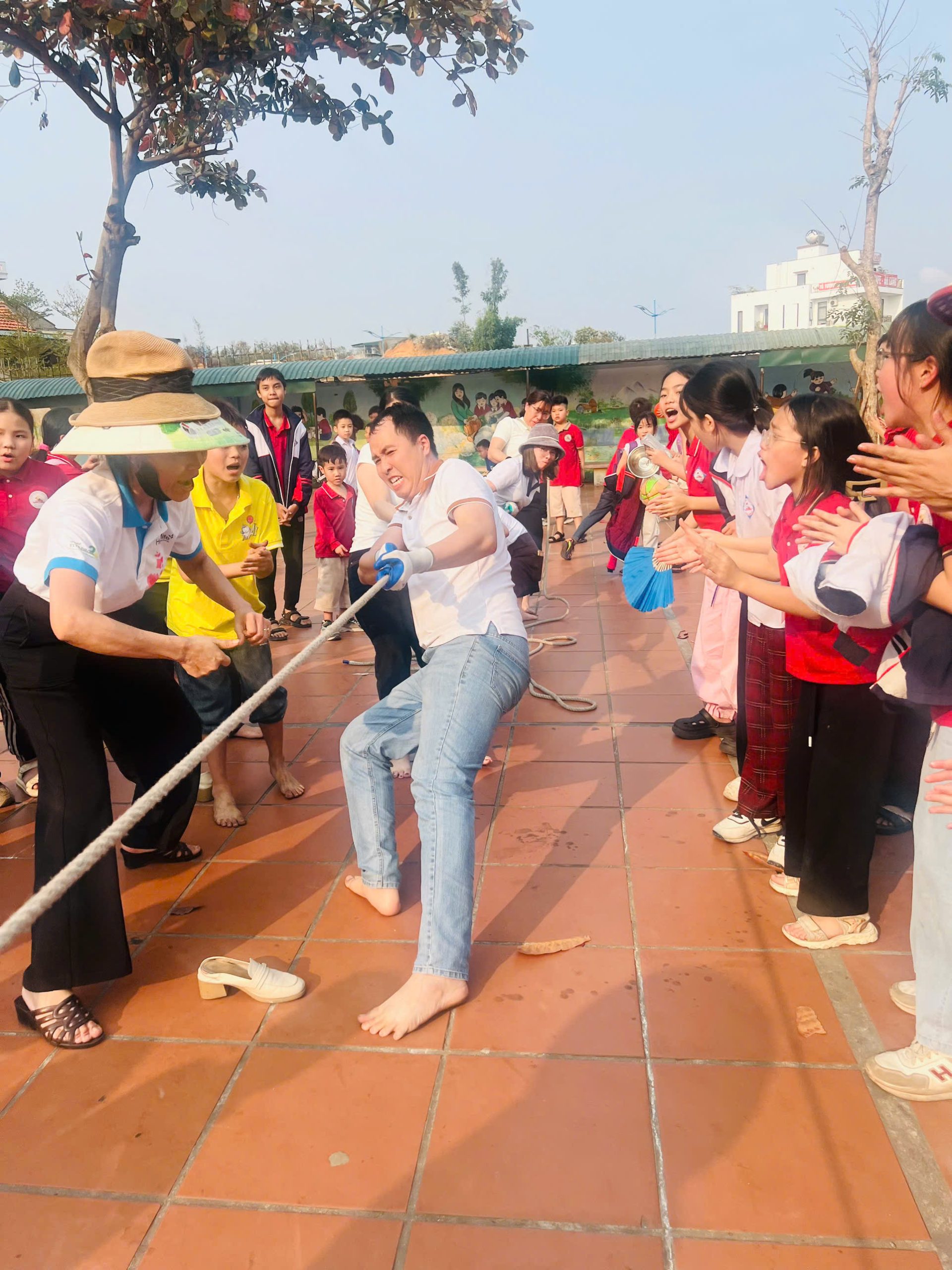 Điểm đặc biệt của ngày hội năm nay là sự tham gia nhiệt tình của các thầy cô giáo trong các trò chơi dân gian. Không chỉ đóng vai trò tổ chức, các thầy cô còn trực tiếp tham gia tranh tài cùng học sinh, làm tăng thêm sự kết nối và niềm vui cho ngày hội. Niềm vui của các em học sinh được nhân lên gấp bội khi thầy Phạm Ngọc Quang – Hiệu trưởng nhà trường cùng các thầy cô và các em học sinh hào hứng tham gia trò chơi kéo co. Khoảnh khắc thầy nắm chặt sợi dây, cùng đội thi đấu hết mình trên sân đã để lại dấu ấn khó quên trong lòng học sinh. Hình ảnh các thầy cô cùng nỗ lực hết mình, cổ vũ và động viên học sinh đã để lại ấn tượng sâu sắc trong lòng các em!