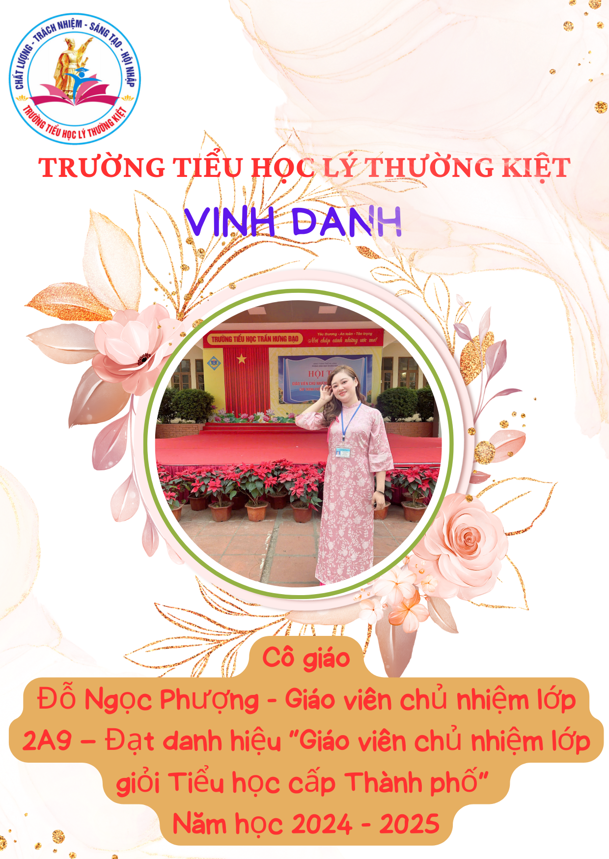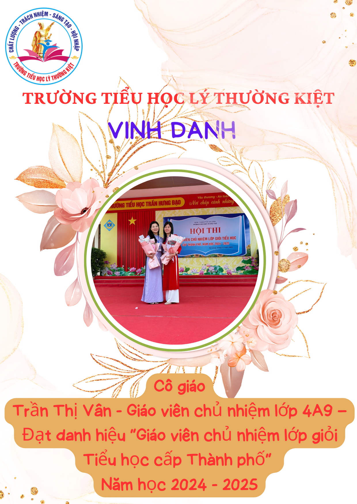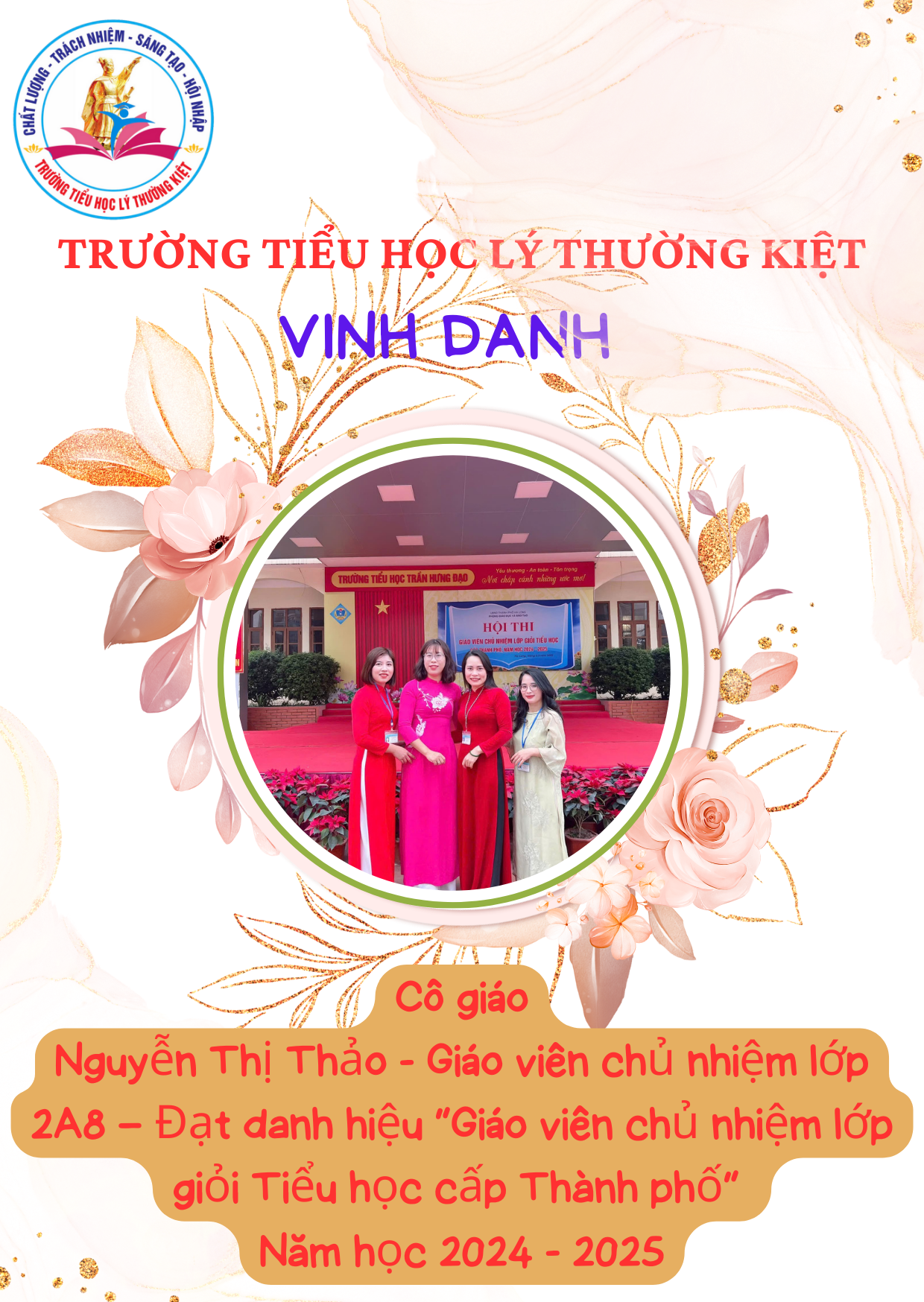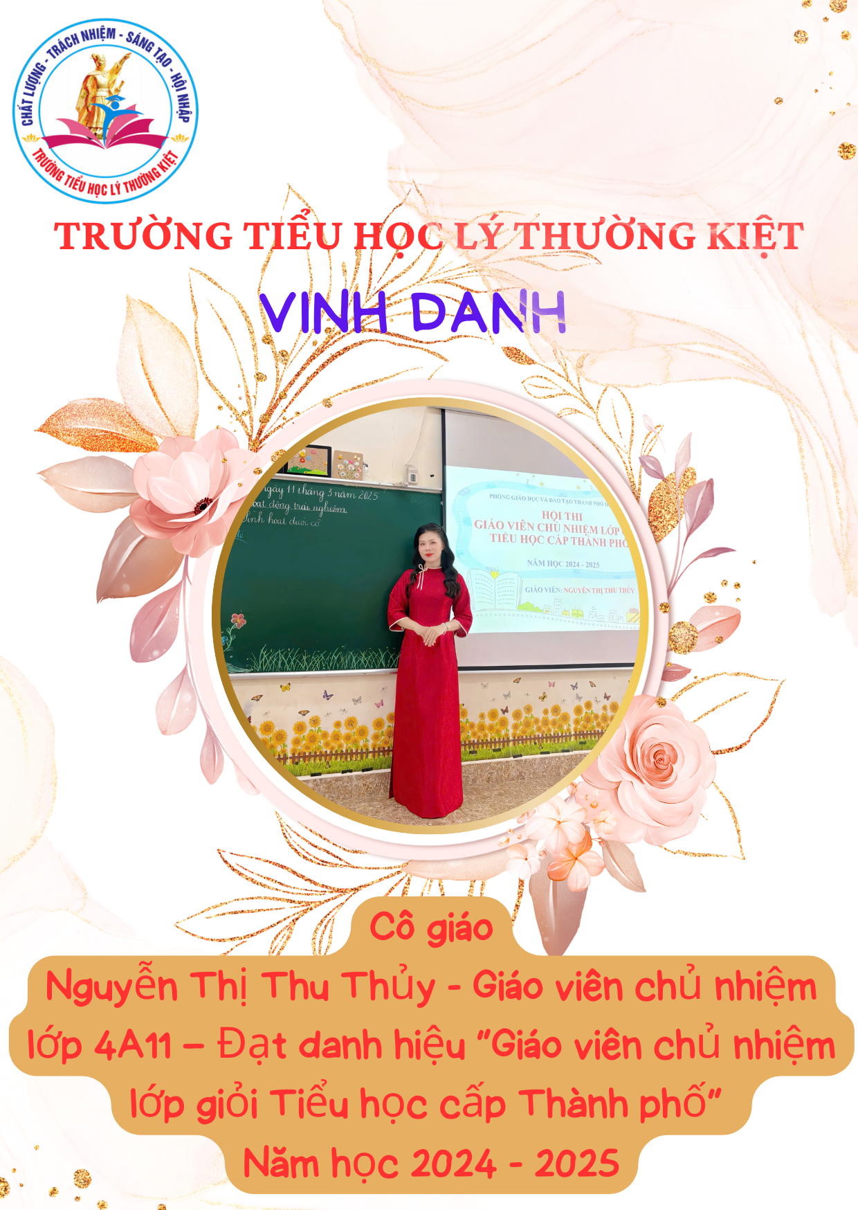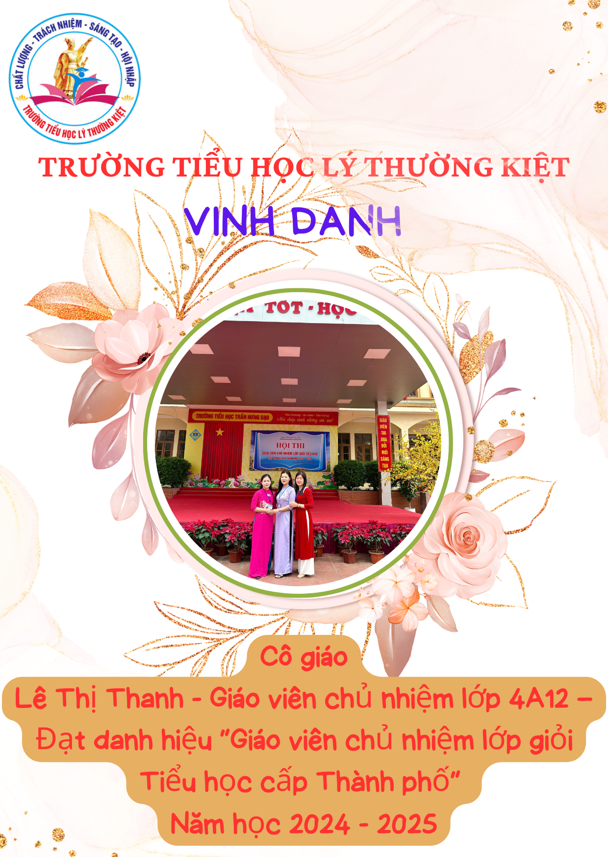 1. Lê Thị Thanh – Giáo viên chủ nhiệm lớp 4A12 – Đạt danh hiệu “Giáo viên chủ nhiệm lớp giỏi Tiểu học cấp Thành phố” năm học 2024 – 2025