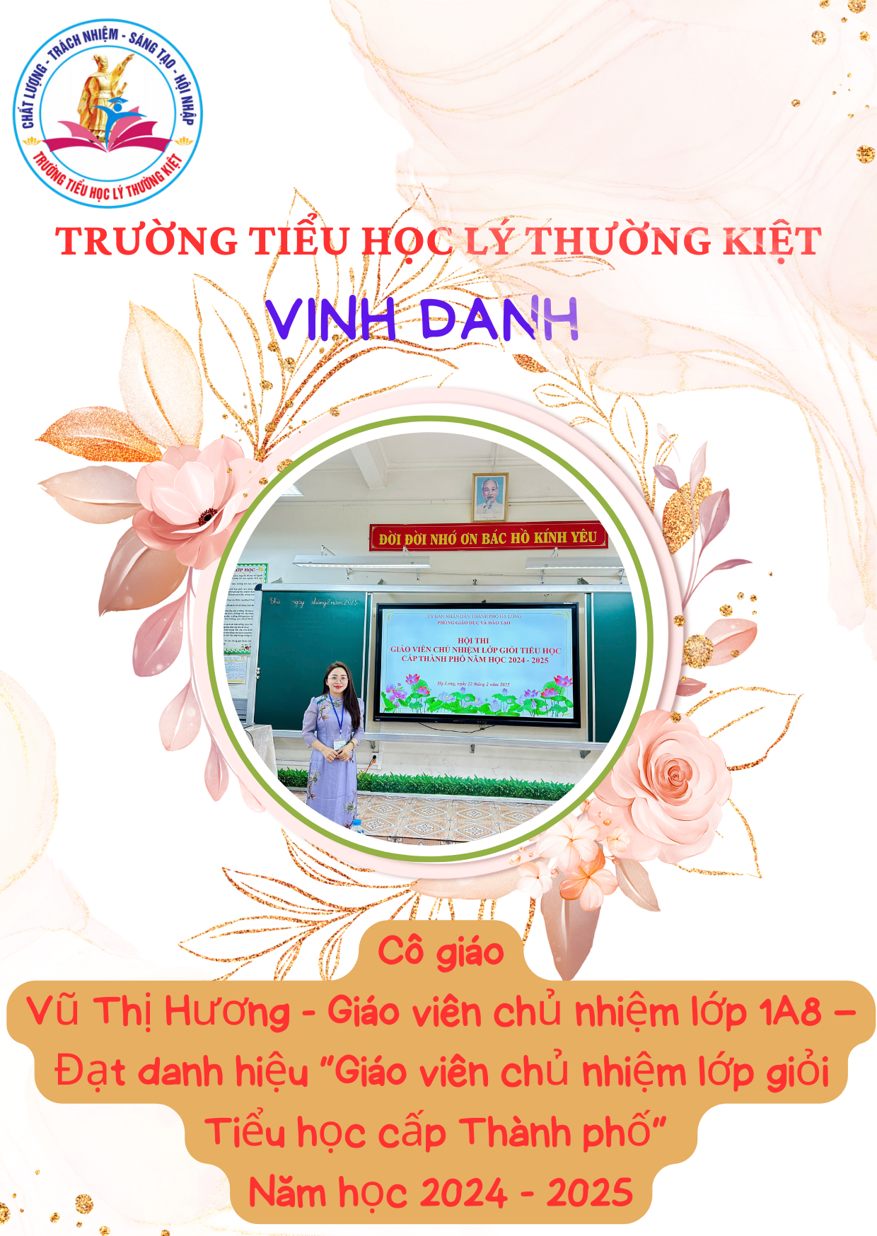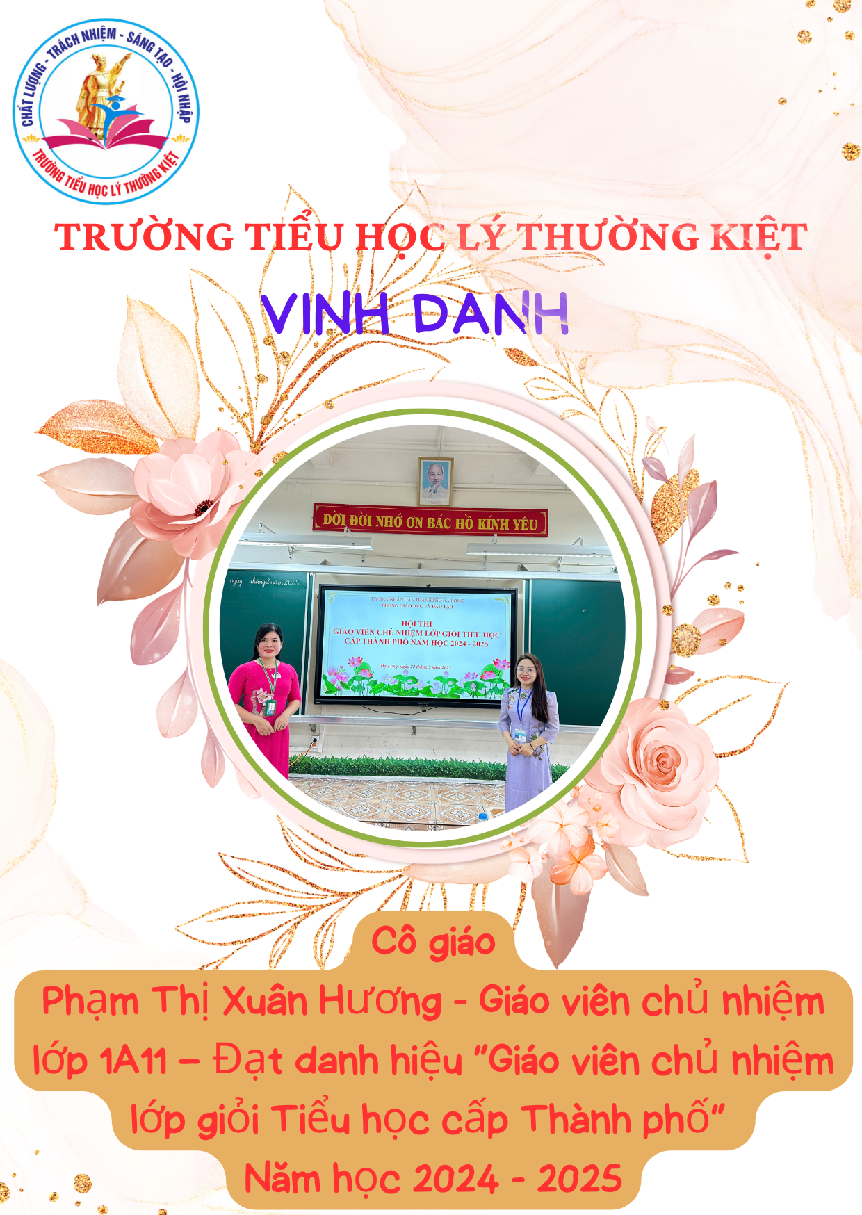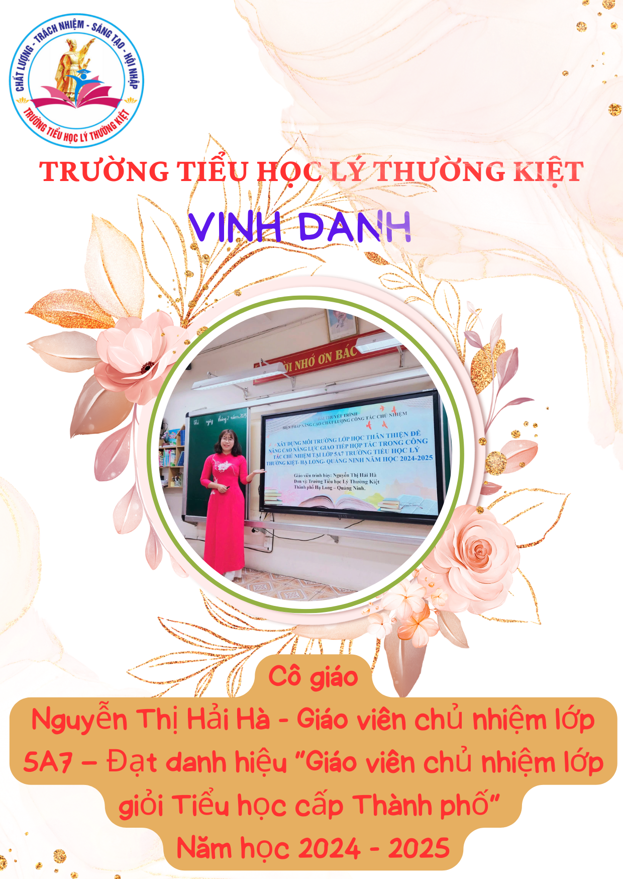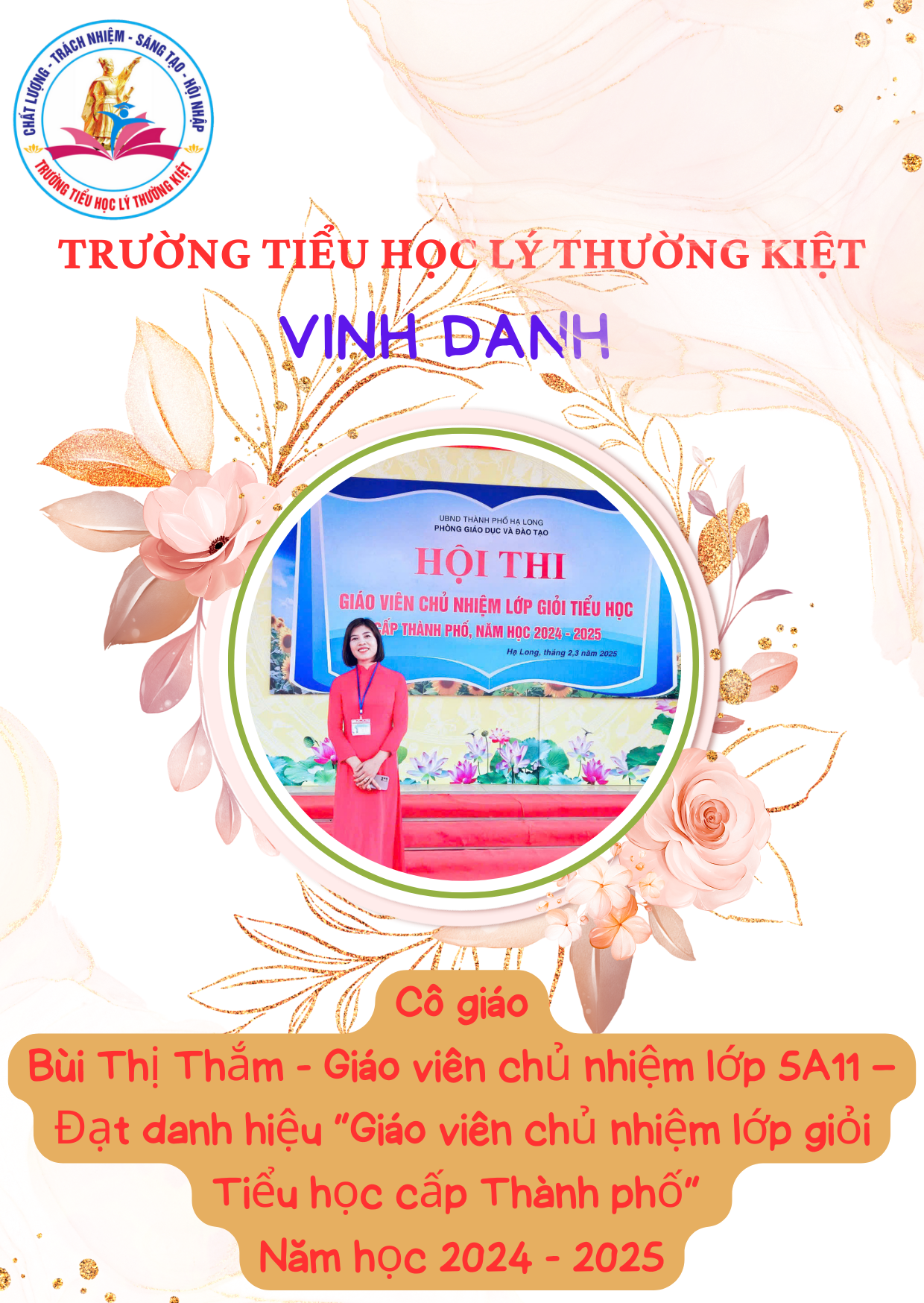 Căn cứ vào Quyết định số 136/QĐ-PGDĐT ngày 31/3/2025 của Phòng Giáo dục và Đào tạo thành phố Hạ Long, Trường Tiểu học Lý Thường Kiệt vinh dự có 10 giáo viên được công nhận danh hiệu “Giáo viên chủ nhiệm lớp giỏi cấp thành phố” năm học 2024–2025.